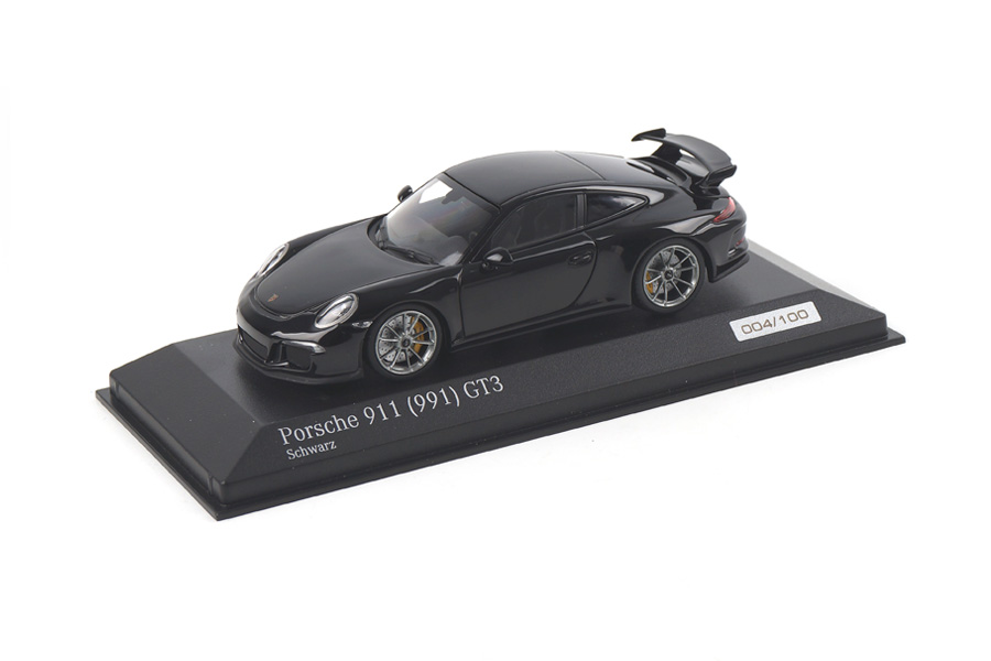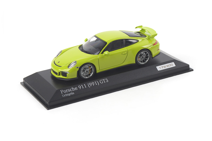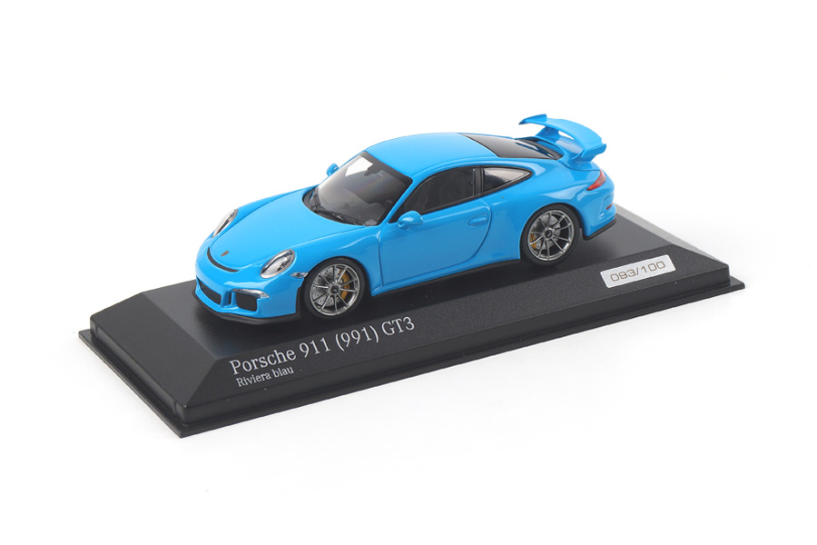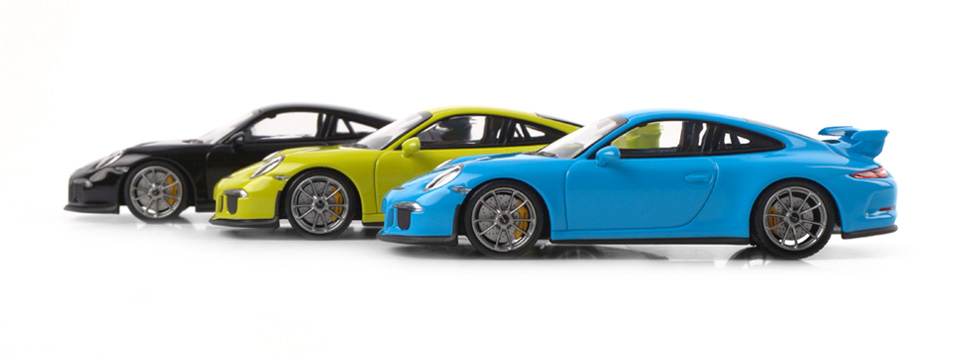 Il negozio tedesco Cartima ha annunciato una serie di tre Porsche 911 GT3 (serie 991) commissionate a Minichamps. Tre le colorazioni: nero (edizione numerata e limitata a 100 esemplari, € 79,95), celeste \”Riviera\” (100 esemplari, € 69,95) e verde chiaro (\”Lichtgruen\”, 200 esemplari, € 69,95). I modelli sono in vendita direttamente sul sito www.cartima.de .