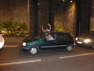 | Fa notte tardi e la gente si mette lungo la strada principale di Arnage a veder passare auto di ogni tipo. |