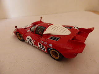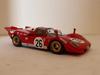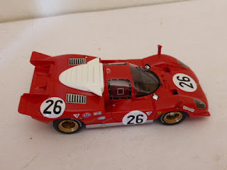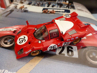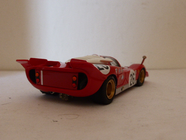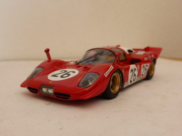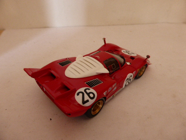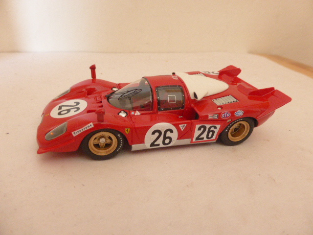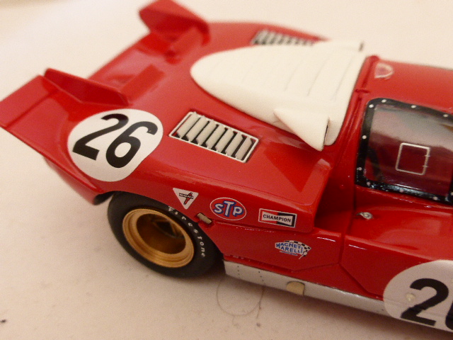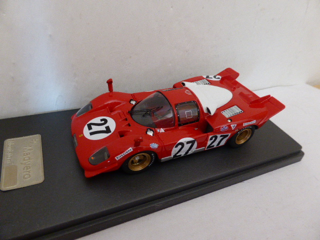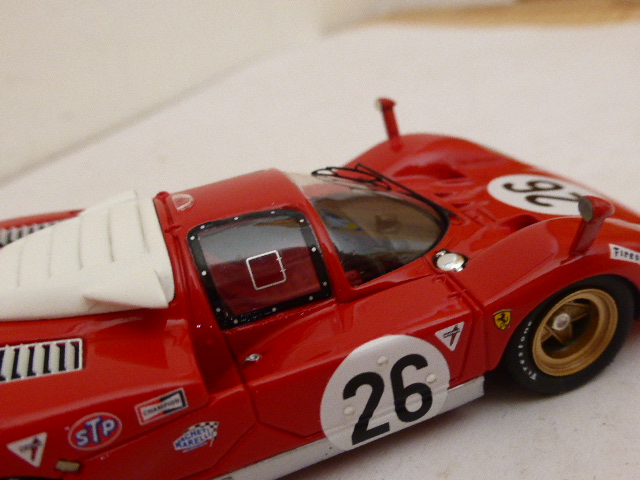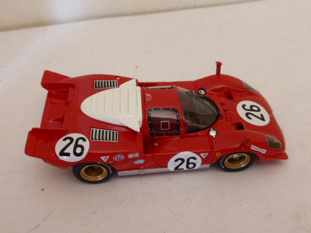 Qui il lavoro è radicale e ha riguardato tutta quanta la vettura, i suoi equilibri, le misure e le proporzioni. Ne è uscita probabilmente la migliore 512S Coupé mai prodotta, e dire che la concorrenza non manca. Le versioni per ora disponibili sono quelle della 24 Ore di Daytona 1970, gara del debutto della 512S, e una bella serie di modelli che riproducono la vettura così come venne presentata alla commissione tecnica della Federazione Internazionale nei giorni dell\’omologazione, ossia ancora priva delle numerose appendici aerodinamiche necessarie a migliorare il comportamento in pista. Ma torniamo alla serie delle auto di Daytona; questa che vi presentiamo è un\’edizione un po\’ particolare, realizzata per il sottoscritto, ma la qualità della produzione ufficiale MG Model è la stessa. In questa prima parte presentiamo le tre auto ufficiali: la n.26 (telaio 1028, Vaccarella/Giunti), la n.27 (telaio 1004 Ickx/Schetty) e la 28 (telaio 1026), forse la più famosa, giunta terza assoluta con Andretti e Merzario.