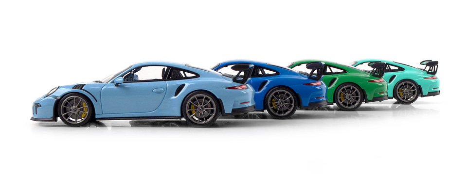 Altre quattro varianti speciali distribuite dal negozio tedesco Cartima su base Minichamps sono disponibili in questi giorni. Il soggetto è la Porsche 911 serie 991 GT3-RS nelle seguenti colorazioni: Gulf blue, voodoo blue, viper green e mint green. Decisamente quattro belle tonalità, che interesseranno diversi collezionisti. Queste edizioni sono in vendita a € 69,95 e ne sono stati previsti 200 esemplari per ogni colore.