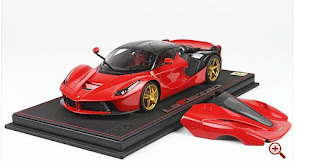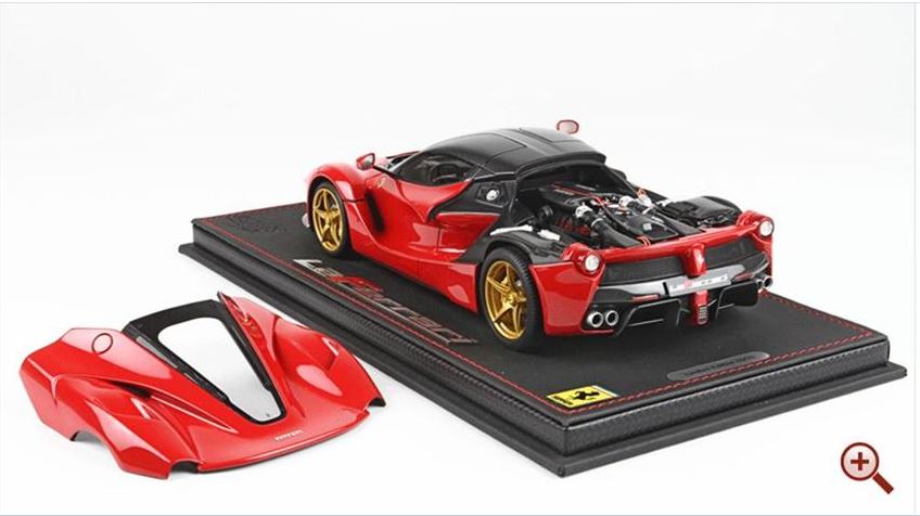 Dieci esemplari numerati de LaFerrari in 1:18, completamente apribile e con dettagli accuratissimi delle varie parti meccaniche sono stati commercializzati da BBR col codice P1867OPENG. Questa particolare edizione de LaFerrari è in Rosso corsa 322 con cerchi oro e tetto in color carbonio. Il modello è confezionato su base in ecopelle e vetrina. Nuovo il badge Ferrari sulla base. Il prezzo è € 405,00 + iva direttamente sul sito BBR Model Store.