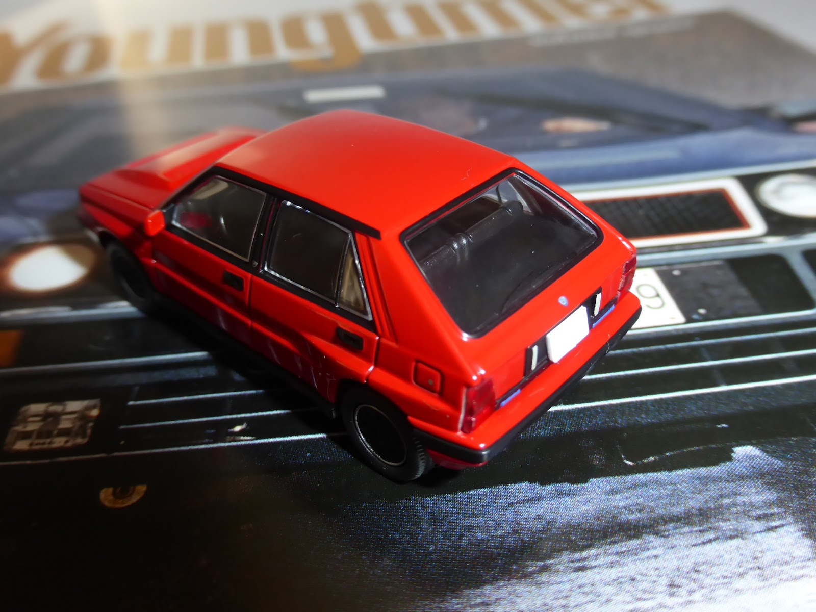 Sulla storia Delta Integrale è inutile dilungarsi troppo; Tomica ha scelto la versione 16V (1989) che esteticamente si contraddistingue per la vistosa gobba sul cofano motore con nuove prese d\’aria.