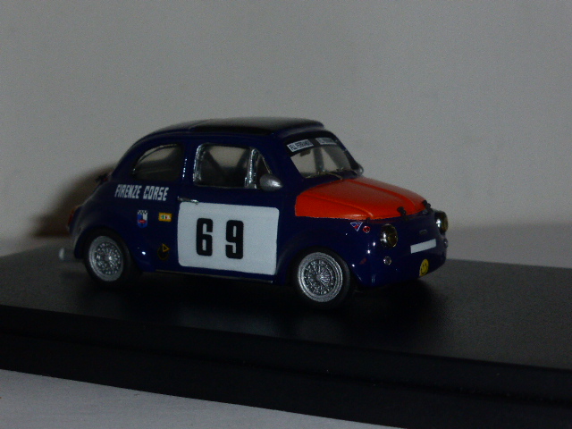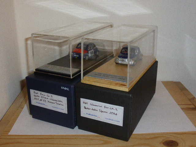 Il primo modello era uscito già nella serie Barnini, ma ovviamente Alex l\’ha migliorato curando particolarmente gli interni e altri piccoli particolari trascurati a suo tempo. Molto precisa la verniciatura bicolore; l\’altra versione è inedita e riproduce la vettura di Michael Tolaini che in quegli anni gareggiava per la Firenze Corse-Biondetti, la scuderia toscana che aveva preso questa denominazione nel 1970, dopo aver iniziato la sua storia alla fine degli anni cinquanta come Scuderia Automobilistica Clemente Biondetti. Anche in questo caso una particolare attenzione è stata dedicata a tanti dettagli in grado di fare la differenza: ganci, maniglie, decals fatte realizzare appositamente per una mini-serie di… due esemplari. Molta cura è stata riservata alla presentazione, con basette e teche di ottima qualità e scatole specifiche marchiate ProModelTek, oltre a un certificato di autenticità.