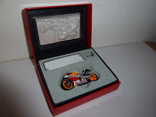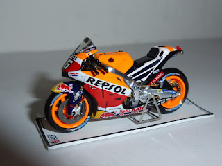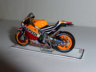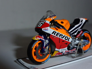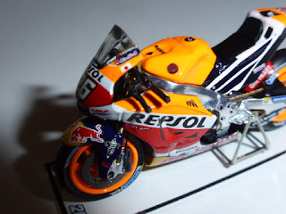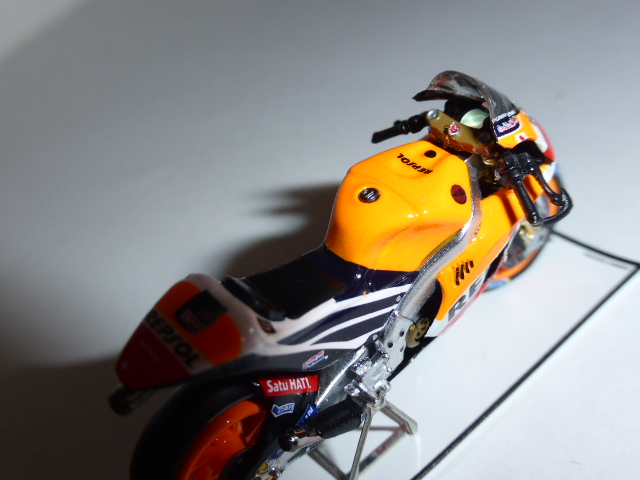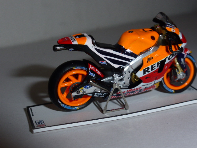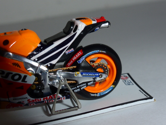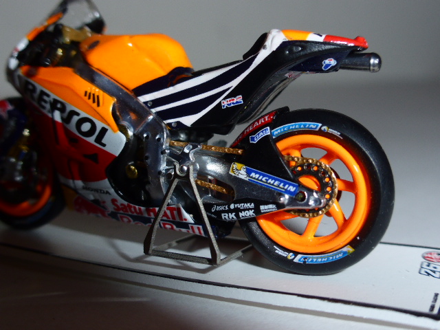 Il modello, in resina con una buona dose di fotoincisioni e di piccolissime parti in plastica, è davvero minuscolo. Per le moto siamo abituati alle grandi scale e l\’effetto è un po\’ bizzarro. L\’intricata doppia livrea Repsol-Red Bull è realizzata benissimo con decals applicate in maniera meticolosa, così come ci si sorprende davanti a una miriade di dettagli che lascia ammirati: ci sono i cavi dei freni, i dischi fotoincisi con i loro supporti, la catena in fotoincisione finissima, le parti in metallo grezzo riprodotte con grande realismo, e chi più ne ha più ne metta.