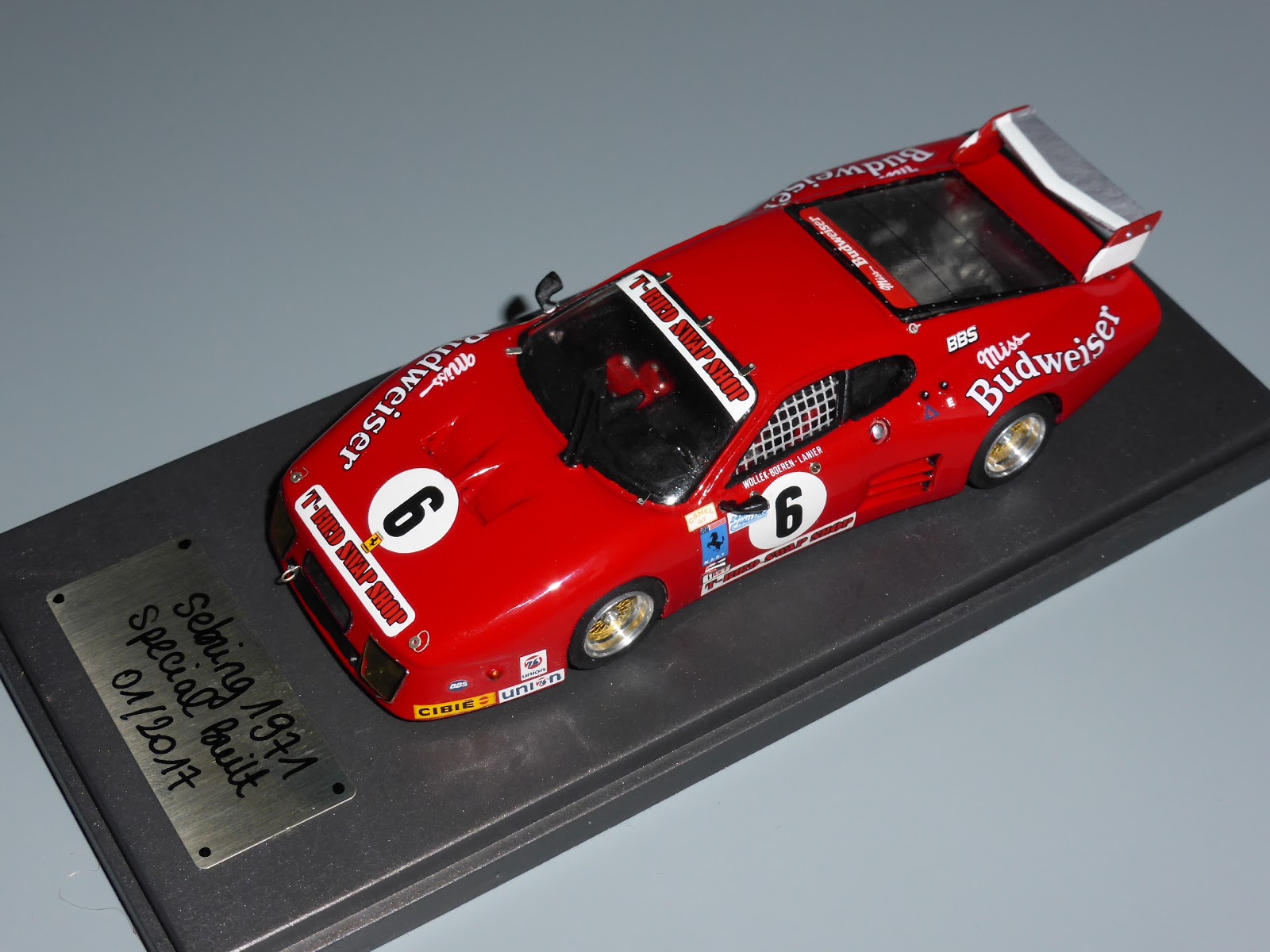 La serie di montati speciali Sebring1971 riprende con una Ferrari 512BB IMSA di Daytona 1982. Si tratta di un vecchio kit FDS in scala 1:43, cui sono state apportate diverse migliorie, quali fotoincisioni, cerchi BBS di fabbricazione Madyero, e diversi piccoli ritocchi per aggiornarlo. E\’ un modello prodotto nel 1991, che ovviamente ricorda molto da vicino l\’AMR.
