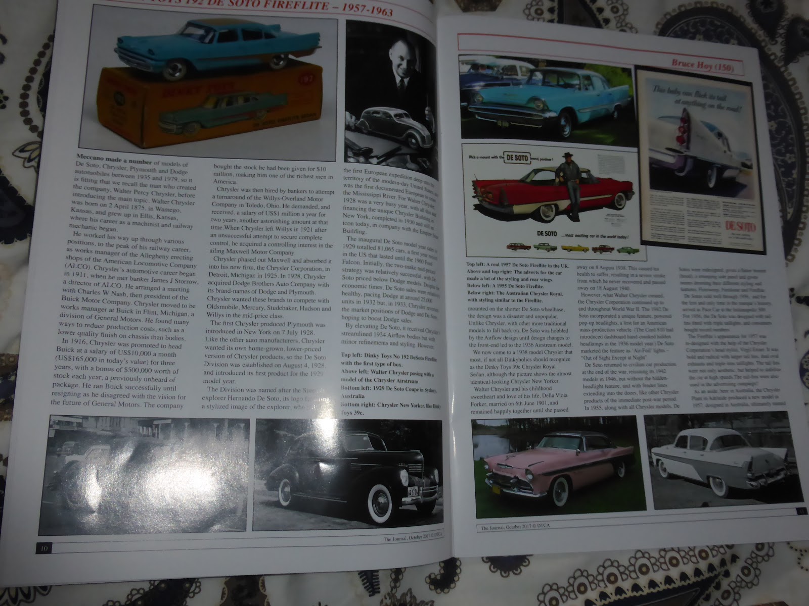 Non consiglierò mai abbastanza un\’iscrizione al DTCA (Dinky Toys Collectors\’ Association) agli appassionati di modelli obsoleti, ma purtroppo, vista l\’ignoranza della maggior parte dei collezionisti italiani, ho paura che queste resteranno parole al vento. In ogni caso, l\’ultimo numero del 2017 della rivista del club si presenta con diversi contenuti di grande interesse: possiamo citare una bella retrospettiva sulla De Soto Fireflite (n.192), accompagnata da una sintetica ma completa storia del marchio De Soto. Molto utile anche il confronto fra le quattro scatole del modello, avvicendatesi nel periodo 1957-1963, ma anche in questo caso immagino che al collezionista italiano medio importi quanto il Processo del lunedì, visto che nella stragrande maggioranza dei casi egli è uso risolvere il problema alla radice, acquistando esemplari senza scatola perché costano meno.