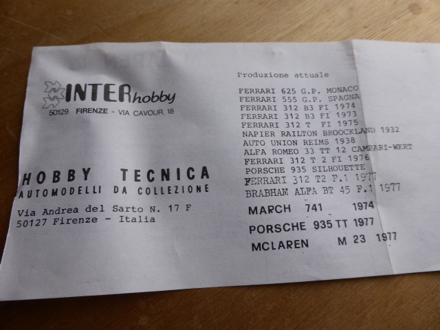 Nel 1977, Hobby Tecnica aveva a catalogo già una quindicina di referenze, che non si limitavano comunque alle Ferrari Formula 1: Giorgetti sceglieva anche soggetti abbastanza particolari, dalla Auto Union del 1938 alla Napier Railton Brooklands 1933; veniva seguita anche l\’attualità del Mondiale Marche, con l\’Alfa Romeo 33TT12 del 1973 e le Porsche 935 e 936 del 1976. In particolare la 935 Martini Racing riscosse un buon successo a Firenze, anche perché molti collezionisti erano presenti alla 6 Ore del Mugello in occasione del debutto della vettura.
