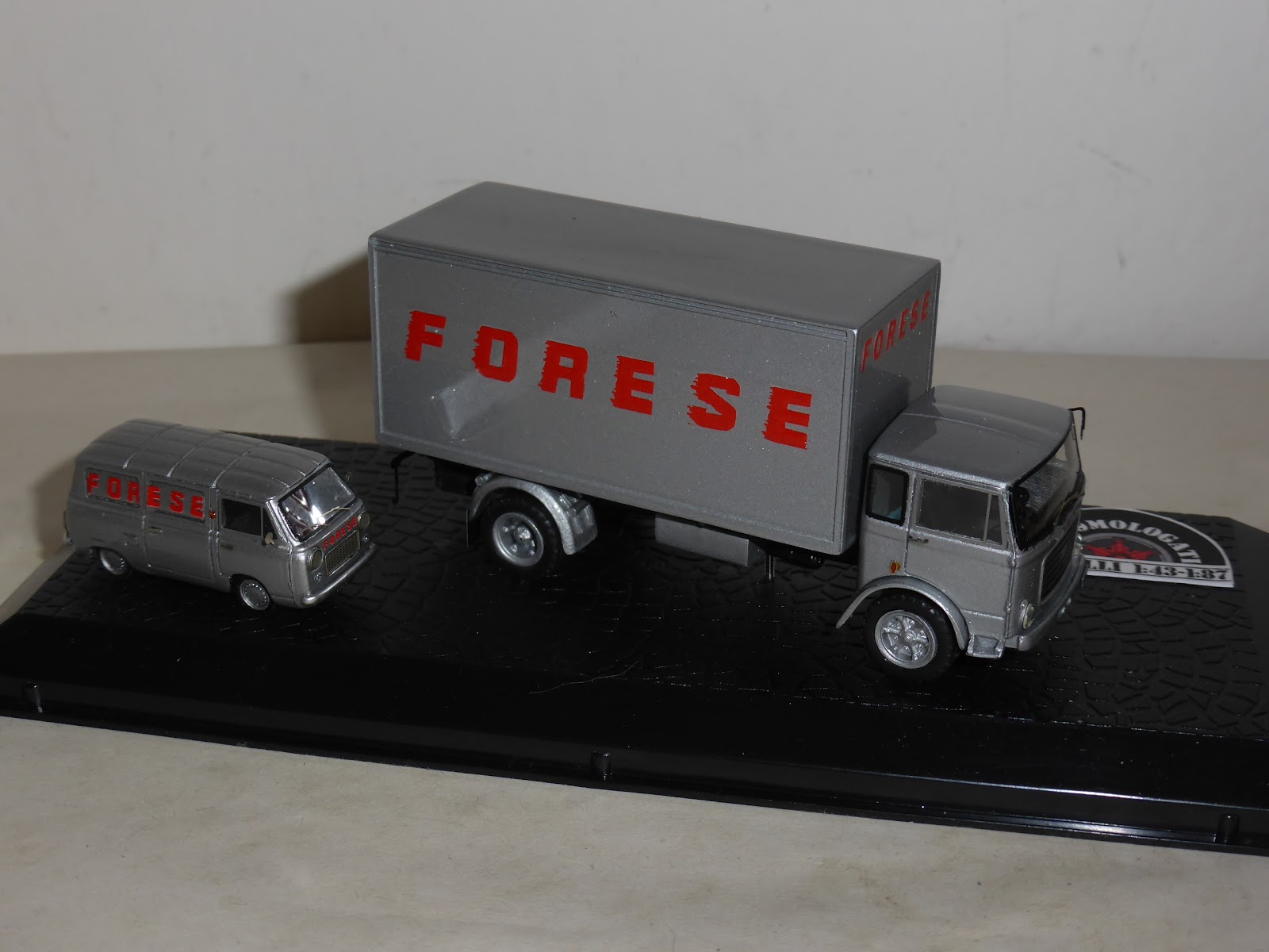 La caratteristica colorazione dei mezzi Forese, argento con i loghi rossi, rende particolarmente bene sui piccoli modelli, che hanno ricevuto particolari cure e dobbiamo dire che il risultato è del tutto all\’altezza delle attese. La produzione è estremamente limitata; quello che vedete in queste foto è il primo set terminato giusto questa settimana. E\’ di sicuro interesse riportare alcune annotazioni tecniche forniteci da Marco Feliziani, uno degli animatori di \”nonomologati\”: \”Il set è formato da un OM 150 e un piccolo Fiat 850T con immatricolazioni che ambientano i due veicoli nel maggio del 1972.