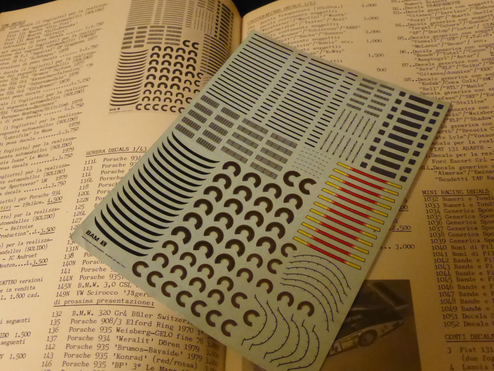 D\’accordo, non si può sempre scrivere dei massimi sistemi. A volte un piccolo aneddoto o una spigolatura storica possono essere interessanti. La Porsche 911 e i suoi derivati sono da sempre un classico nella produzione modellistica. E negli anni settanta-ottanta, con la produzione Solido alla base di certe collezioni 1:43, avere a disposizione delle decals che migliorassero i già buoni prodotti francesi era un\’esigenza non trascurabile. Ci pensò abbastanza presto la BAM, che alla fine degli anni settanta fece stampare alla Cartograf un foglio piuttosto grande contenente moltissime decal necessarie per decorare le varie 911 Carrera RS, 934 di Solido e altri modelli similari. La BAM aveva già prodotto fogli di decals molto utili, di cui i collezionisti ricordano ancora perfettamente le livree, e questo \”generico Porsche\”, che misurava cm 19×14, ebbe come si può facilmente immaginare, un buon successo. In Italia costava, tramite i fratelli Tron di Loano, 4.500 lire, più o meno a metà strada fra un transkit fra i meno complessi (che si attestava sulle 3.500 lire) e quelli più ricchi di particolari (sulle 5.000 lire). Una riproduzione di questo foglio di decals compare a pagina 28 del TSSK n.20 della primavera 1980 (foto sopra).