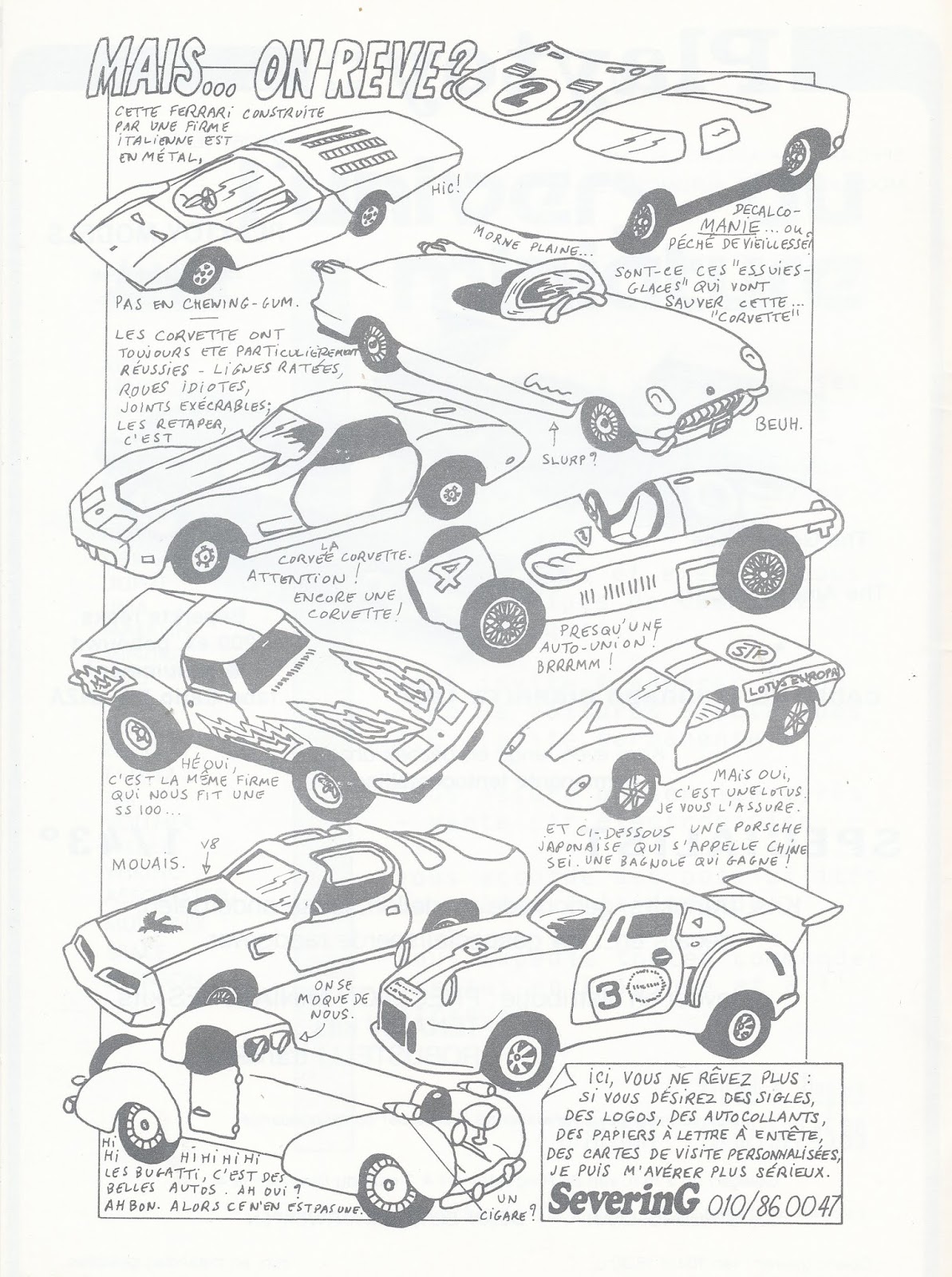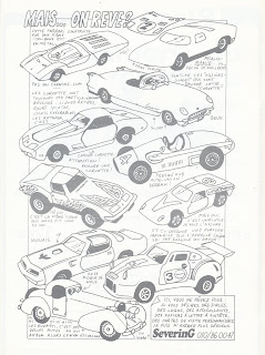 Oggi i vari Politoys, Solido, Dinky e Corgi degli anni sessanta sono ricercati dai collezionisti di obsoleti, che riescono ad apprezzarli per quello che erano, ossia dei giocattoli, per quanto ben costruiti. Gli appassionati di modellismo dell\’epoca, invece, quelli che montavano i kit e apprezzavano le varie produzioni di punta, vedevano in ciascuno di questi modelli un\’occasione perduta. A livello di diecast c\’era già Brumm, che tuttavia alternava riproduzioni ottime ad altre decisamente scadenti; c\’era Rio, c\’era stata Dugu, ma il periodo preso in considerazione (1900-40 circa) non era in grado di soddisfare le richieste di chi puntava soprattutto sugli anni recenti o sull\’attualità. Nel catalogo di una delle famose borse di scambio di Woluwe (Bruxelles) apparve una buffa vignetta ad opera di un grafico locale che testimoniava la rabbia con la quale i collezionisti potevano accogliere qualche riproduzione decisamente… fuori parametro. Ce n\’è per tutti i gusti, dalla Ford GT40 di Solido (caratterizzata da tutti i dettagli del cofano riprodotti da una semplice decal) alla Ferrari 500 della Brumm, paragonata a un\’Auto Union, dalla ridicola Porsche Carrera RSR Turbo di Shinsei alla Lotus Europa di Politoys.