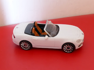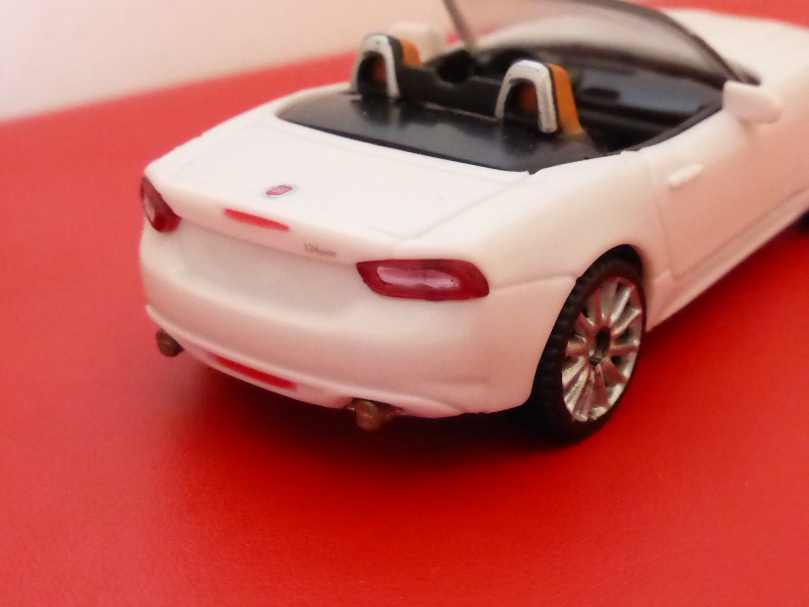 I gruppi ottici,in plastica, sono riportati, e gli interni sono riprodotti con sufficiente definizione. I marchi Fiat sul cofano e sul portabagagli sono tampografati. Più che accettabile è il parabrezza con i tergi stampati e la cornice color alluminio. Il punto debole sono le ruote, di diametro troppo generoso e con gomme (in un pezzo unico col cerchio) troppo largo. In ogni caso questa 124 Spider resta per il prezzo un modello decoroso, che potrà costituire una valida base per elaborazioni di vario tipo.