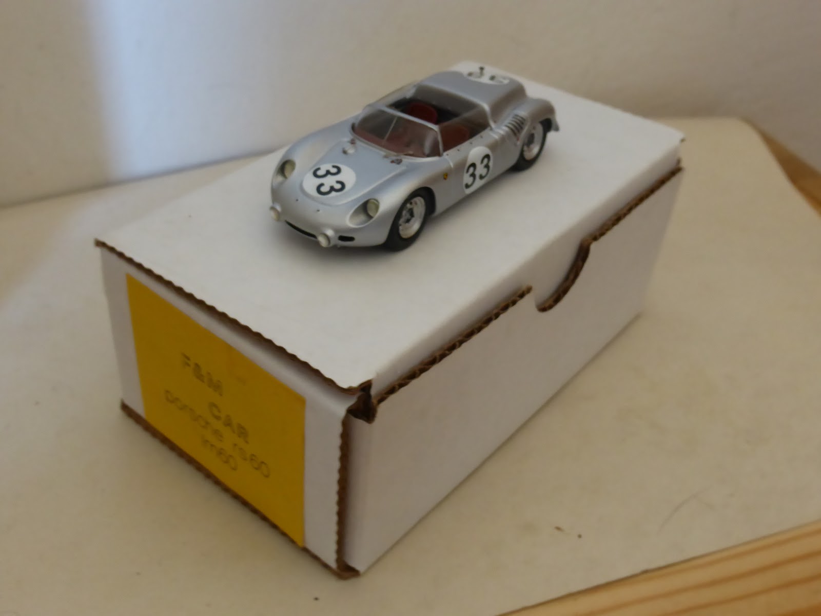 Negli anni ottanta i piccoli marchi di modelli speciali, spesso a conduzione poco più che casalinga, fiorivano come funghi. C\’erano ancora tantissime lacune da colmare e il mercato dei diecast non copriva che una frazione della domanda. Il sistema di vendita era naturalmente del tutto diverso da quello di oggi: non esistendo Internet, ci si affidava ai maggiori rivenditori e distributori. I collezionisti, in Italia, avevano il TSSK di Tron, che era il vero Internet degli anni ottanta. Molti non avranno mai sentito parlare di F&M Car e in effetti il marchio ebbe vita breve, ma vale la pena di recensirlo, anche perché i suoi due animatori furono due collezionisti e appassionati di primo livello, Fabrizio De Gennaro e Massimo Martini (da qui la sigla FM). Martini era già un affermato e conosciuto collezionista di modelli Porsche a Firenze, mentre De Gennaro aveva rivolto la propria attenzione sui marchi italiani, e ancora oggi i due – seppur discretamente – continuano la loro vicenda collezionistica lontani da certi clamori e dalle conventicole tipiche di questo settore, che non portano quasi mai a nulla di buono. Poco dopo la metà degli anni ottanta uscì il primo modello della collaborazione tra De Gennaro e Martini, una Porsche 718 RS60 in versione Le Mans 1960 (numero 33, Graham Hill / Jo Bonnier).