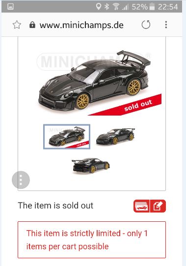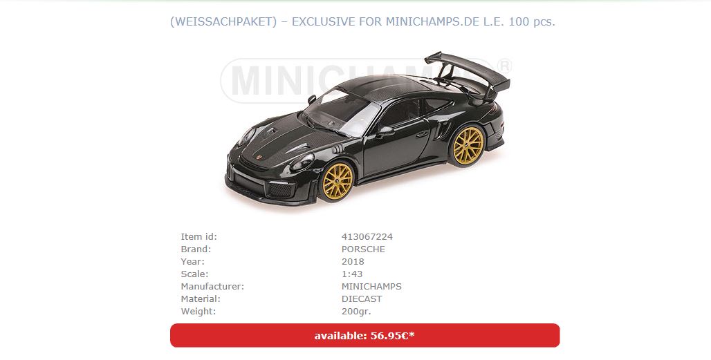 Oggi per caso ho letto con maggiore attenzione una delle loro mail promozionali, in cui era annunciata la disponibilità di una variante verde Brewster della già notissima Porsche 911 (modello 991.2) GT2RS in scala 1:43. Prodotta in soli 100 esemplari numerati e venduta esclusivamente dalla Casa, questa Porsche è stata messa ufficialmente in vendita alle 10.30 di stamani. Ebbene, verso le sei di sera restavano poco meno di 10 esemplari disponibili, che sono rapidamente scesi a 2 intorno alle otto per poi andare definitivamente a zero dopo una manciata di minuti. Insomma, un centinaio di modelli fatti fuori nel giro di mezza giornata, e il risultato è tanto più impressionante dato che non si tratta di vendite a negozi o a professionisti in genere, che poi rischiano di tenersi sul groppone i modelli per mesi se non per anni (il famoso \”esaurito presso il produttore\” che non è un indice necessario del successo di una referenza), ma di vendite al cliente finale, e per impedire fenomeni di speculazione dal sito era possibile ordinare un solo modello per persona. Limite peraltro abbastanza facile da aggirare, ma non è questo il punto. Il punto è che un costruttore come Minichamps è capace di ottenere questi risultati, mentre altri non ci arrivano. I motivi sono molti e già noti, ma evidentemente il sistema funziona ancora, eccome.