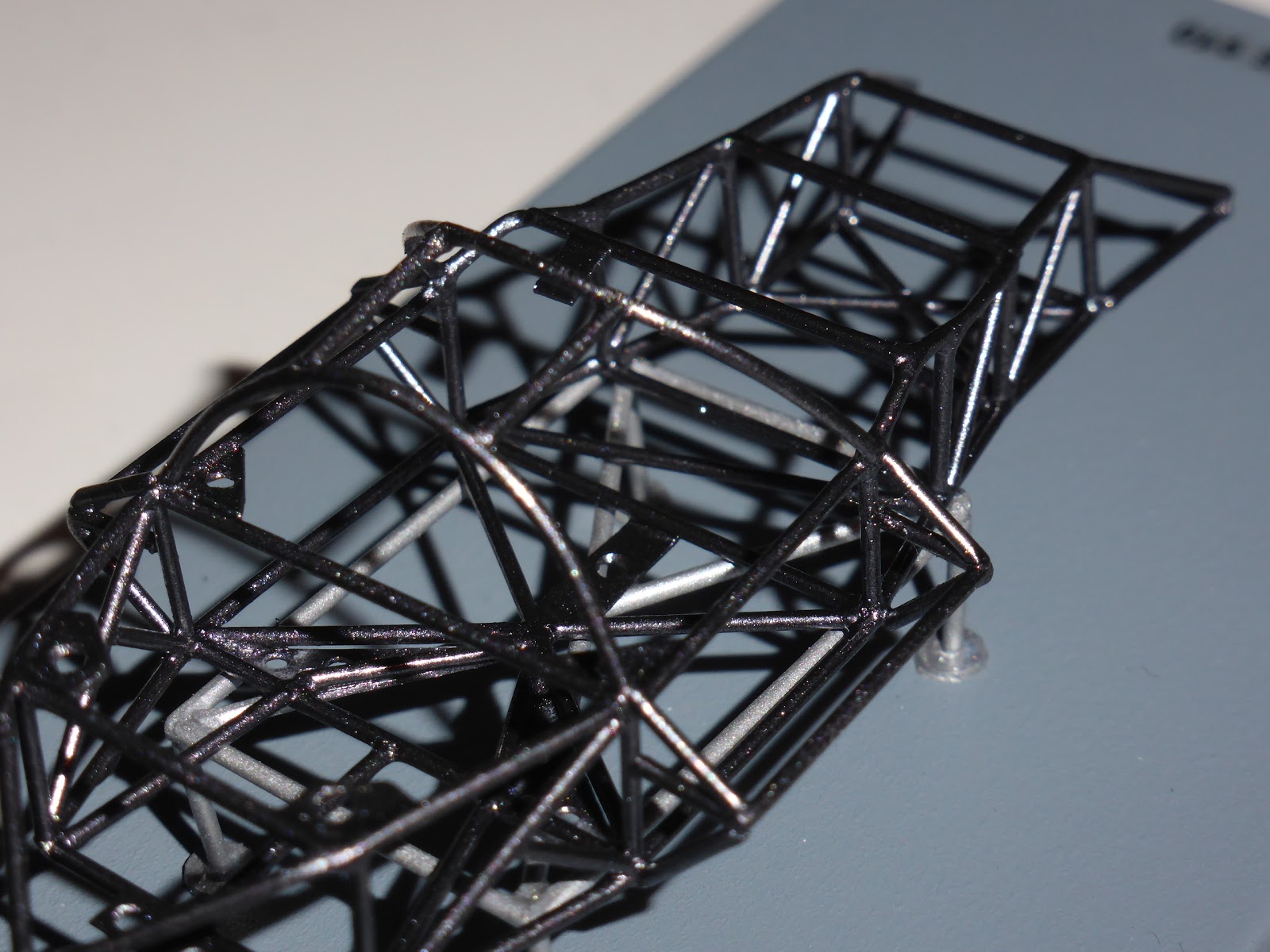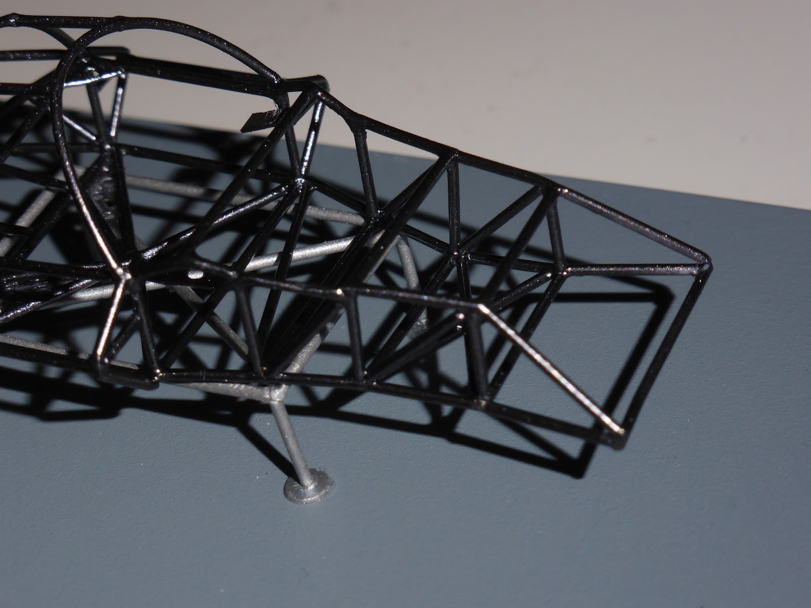 La tecnica è stata sviluppata con l\’esperienza: si parte per lo più dalla zona centrale, cercando di non creare scompensi che altrimenti si ripercuoterebbero su tutta la struttura; si fa attenzione a centrare bene i rinforzi a croce, procedendo via via verso l\’anteriore e il posteriore. Ci vuole occhio, pratica e un briciolo di fortuna per azzeccarle tutte alla prima o almeno per non rovinare irrimediabilmente tutto. Il plasticard, forse meno \”nobile\” di altri materiali, si presta tuttavia maggiormente ad essere tagliato senza sbavature e ad essere incollato senza tracce di unione fra una barra e l\’altra, come rischia invece di avvenire saldando i metalli. Alla fine il risultato è equivalente e forse anche più convincente di quello che si sarebbe ottenuto saldando per esempio dell\’ottone.