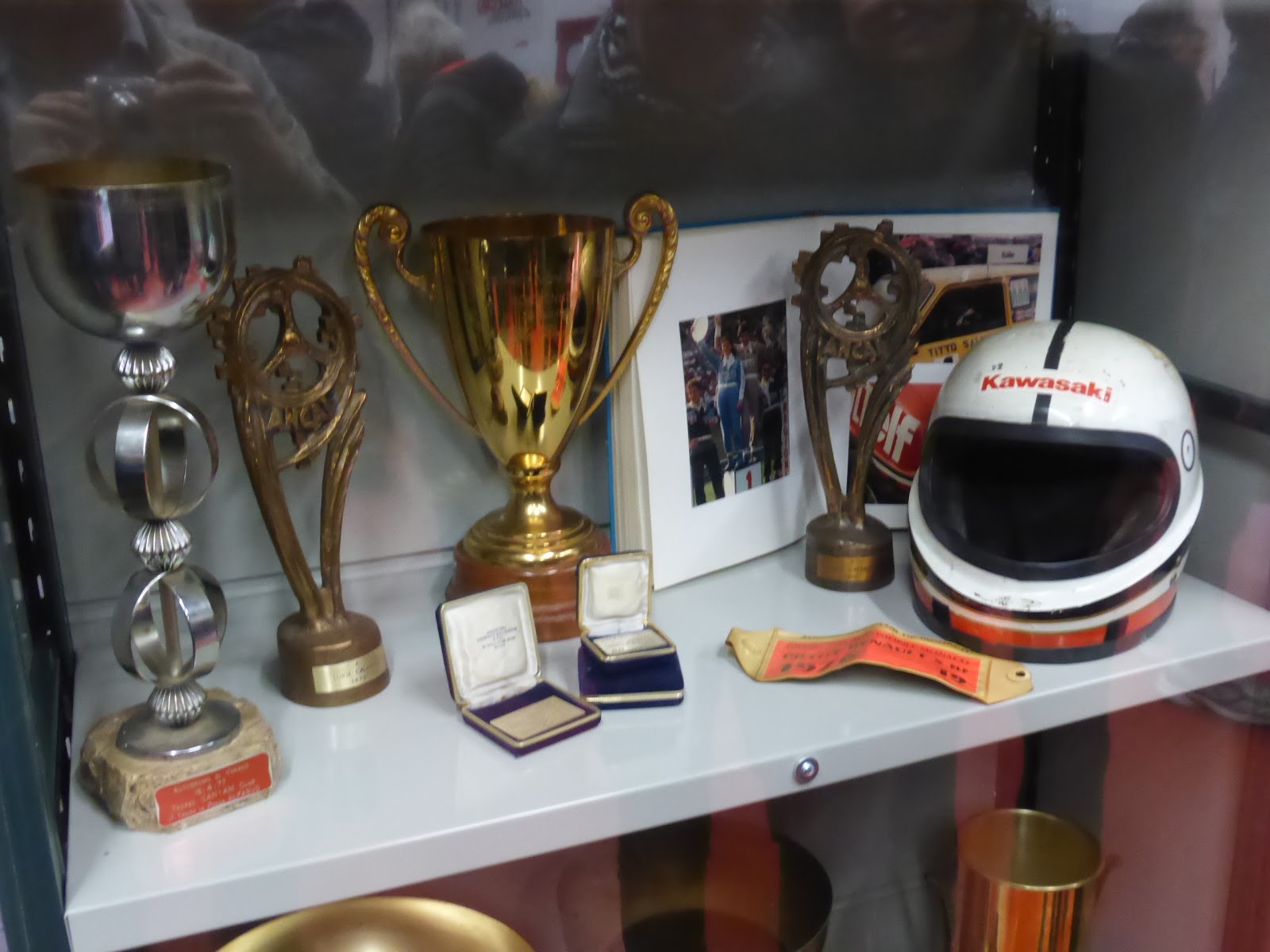 | Erano esposti cimeli preziosi come coppe, caschi e tute appartenuti a Luigi Calamai. |
