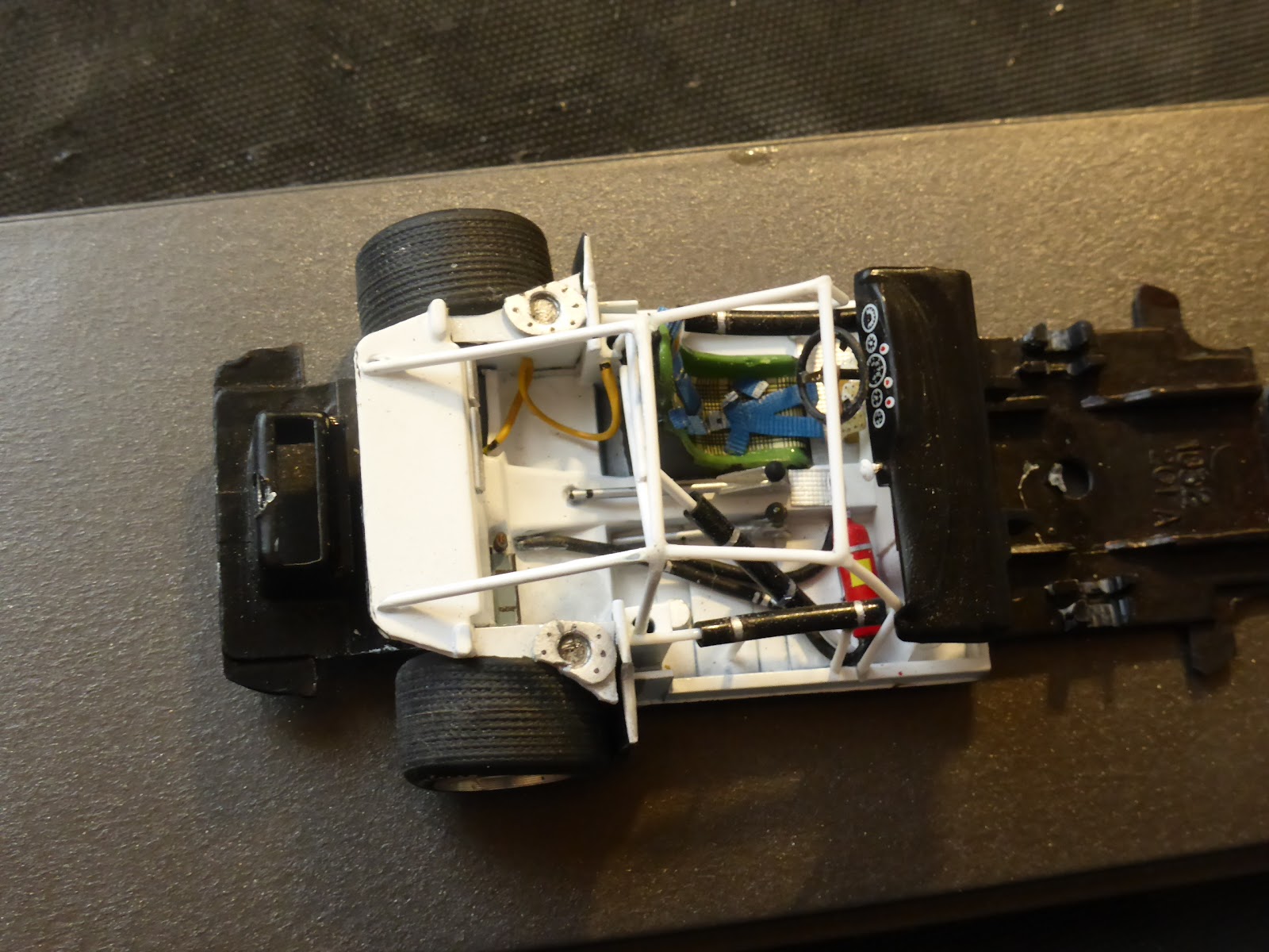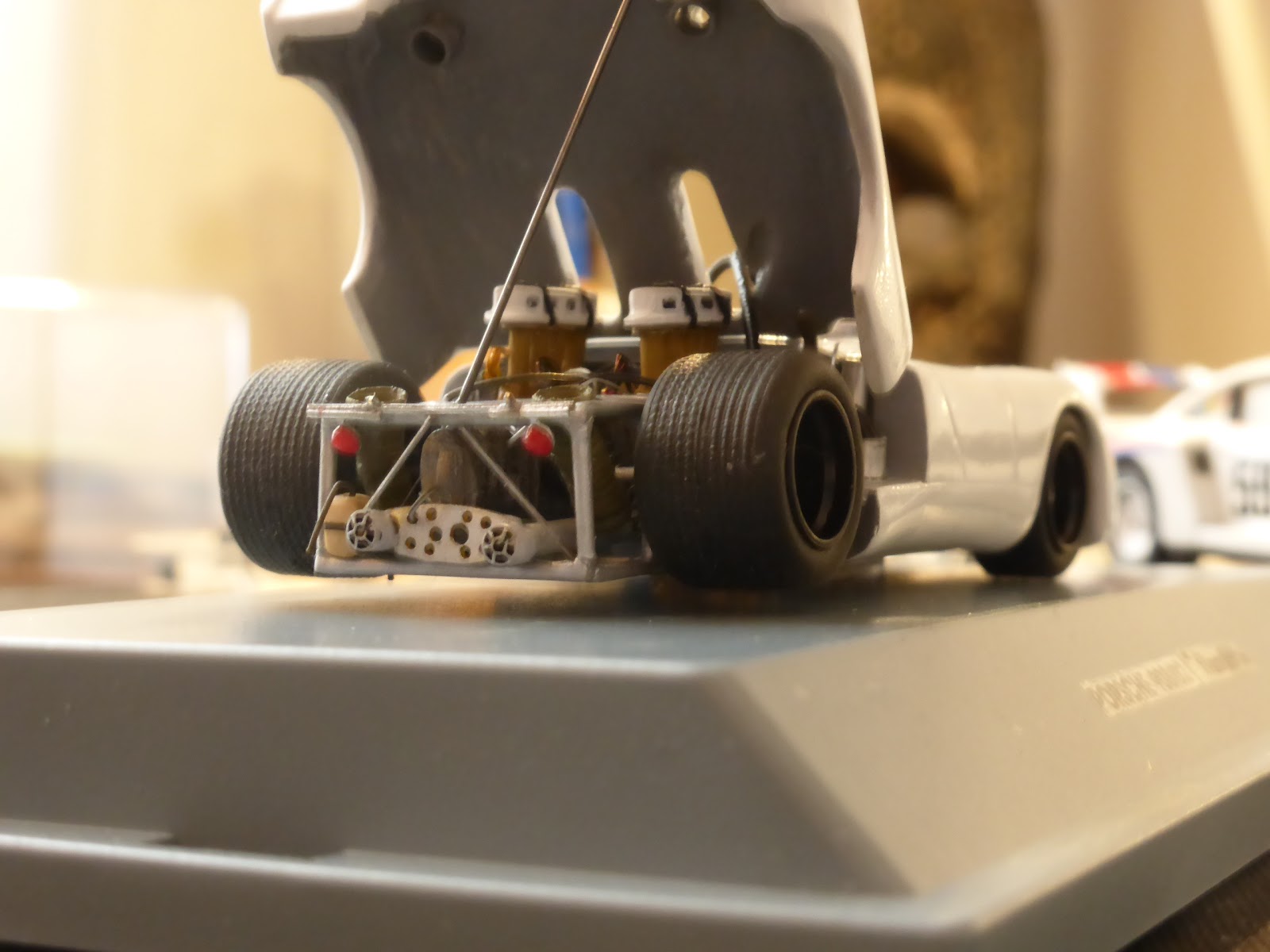 Nelle scorse settimane ha ripreso in mano quella massa quasi informe di resina e stucco che aveva tra l\’altro perso tutte le incisioni, e l\’ha trasformata in un modello aperto, autocostruendo completamente tutta la meccanica e la telaistica del posteriore. Un bel lavoro, senza dubbio, lungo e complicato, favorito dall\’esperienza che Massimo ha accumulato nell\’autocostruzione dei telai in plasticard (vedere ultimo numero di Modelli Auto e altre realizzazioni già pubblicate sul blog). La soddisfazione dell\’esecutore è evidente.