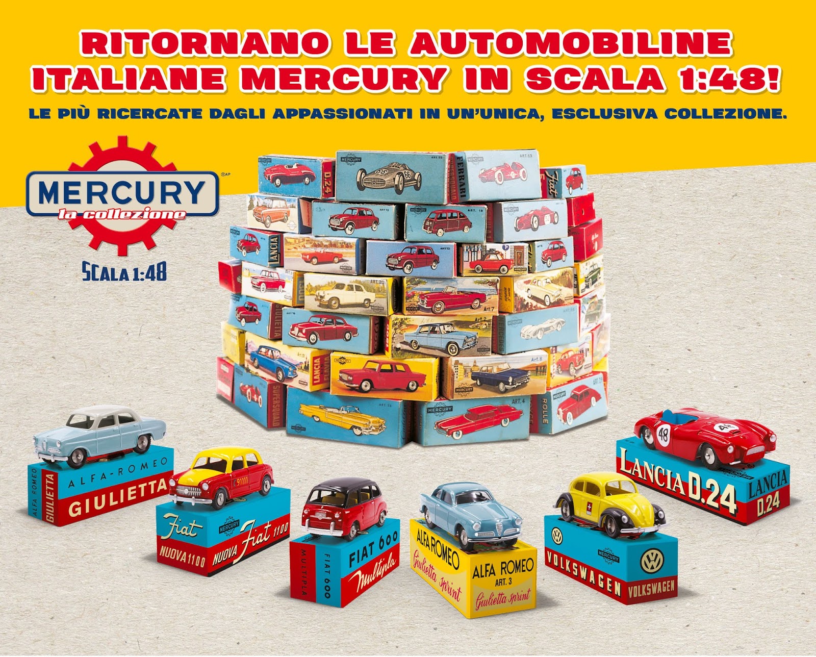 Dopo l\’uscita di un test, Hachette ha annunciato l\’avvio ufficiale della Collezione Mercury, basata sulla celebre serie in scala 1:48. Composta prevalentemente da vetture italiane, la produzione Mercury in 1:48 è una delle più celebri nella storia dell\’automodellismo, comprendendo tra le altre alcune delle più iconiche vetture Alfa Romeo, Lancia e Fiat degli anni cinquanta-sessanta. La collezione prevede anche alcuni bonus, come un portachiavi con lo stemma Mercury oltre a una documentazione tecnico-storica relativa alle vetture reali e ai modelli. Alcune uscite si preannunciano particolarmente interessanti e rispecchieranno versioni che nell\’originale sono rarissime, come la Fiat 1100 Taxi di Berna, il Maggiolino della PTT o la Giulietta berlina bicolore. Sarà l\’occasione per far conoscere ai collezionisti alcuni risvolti meno noti della storia della Mercury. La domanda che alcuni si fanno è sempre la stessa: quanto impatto sui modelli \”veri\” hanno queste collezioni di riedizioni? A livello di quotazioni, nessuno, e questo si è già ampiamente visto con le uscite Dinky Atlas.