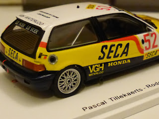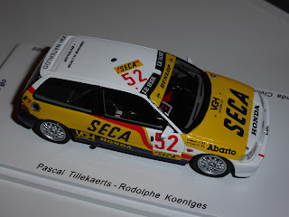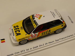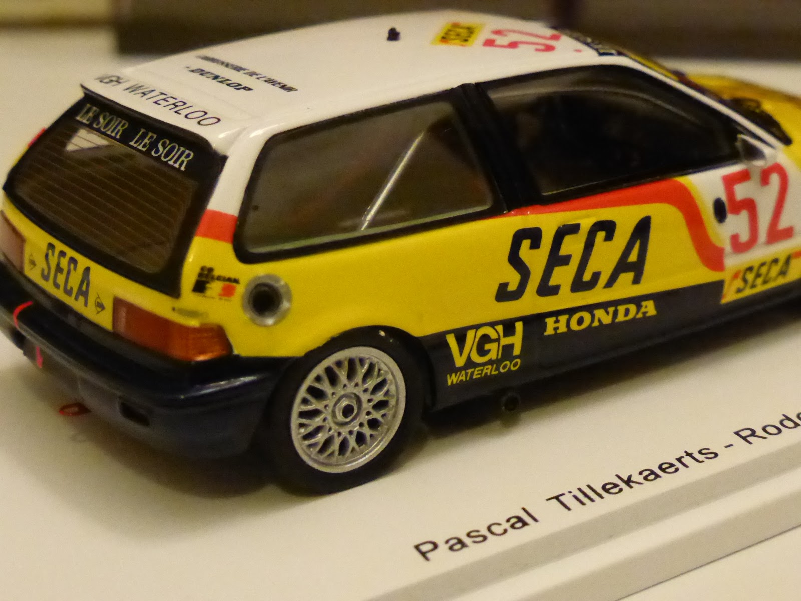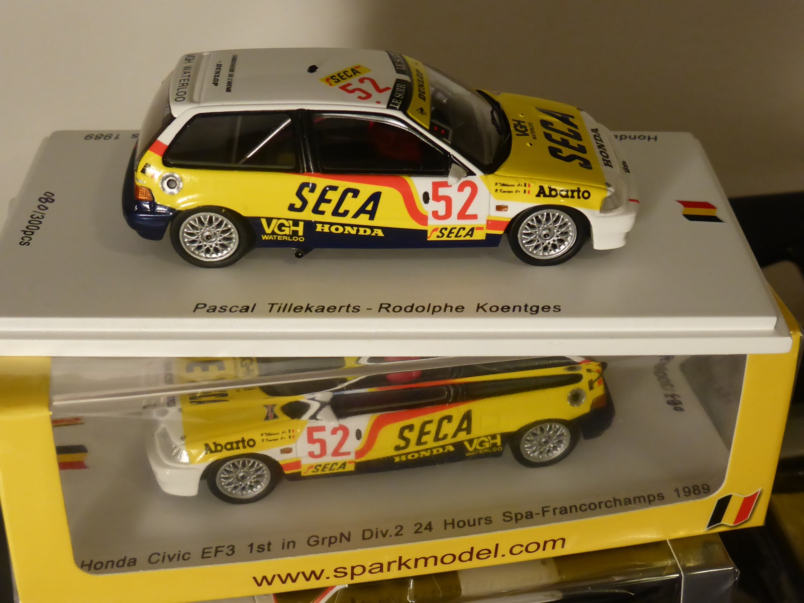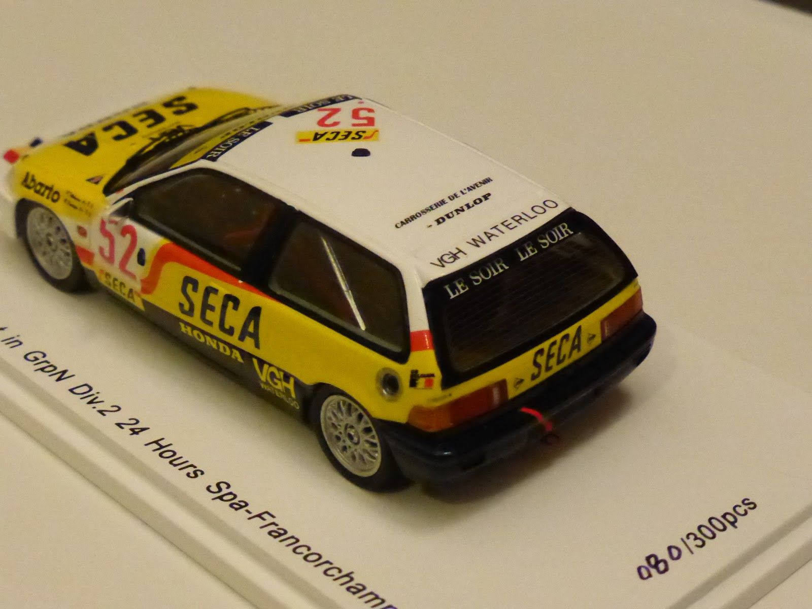 Apparentemente banale oppure addirittura peregrina. Qualche vettura, dentro una collezione o fra uno stock di modelli da rivendere ci sembra capitata per caso. Invece sono proprio i modelli che sembrano capitati lì per caso possono nascondere la suggestione di storie lontane. Spark ha recentemente sfruttato uno stampo giù esistente, l\’Honda Civic serie EF3, per ricavare una versione di Spa. Quanti in Italia l\’apprezzeranno? Penso pochi. In Belgio, ovviamente, avrà il suo pubblico, ed è proprio per il mercato belga che questo modello è nato (catalogo SB136, edizione limitata a 300 pezzi numerati). Questo modello parla di una 24 Ore di Spa che non esiste più, quella fatta con le turismo. Viste come sono andate le cose nell\’automobilismo, il fatto che oggi ci siano le GT è da considerarsi una fortuna, ma i nostalgici percorrono strade alternative. Una Spa che sa di patatine, con tante macchine banali colorate. Già lo sponsor, Seca, è tipico di quelle zone.
