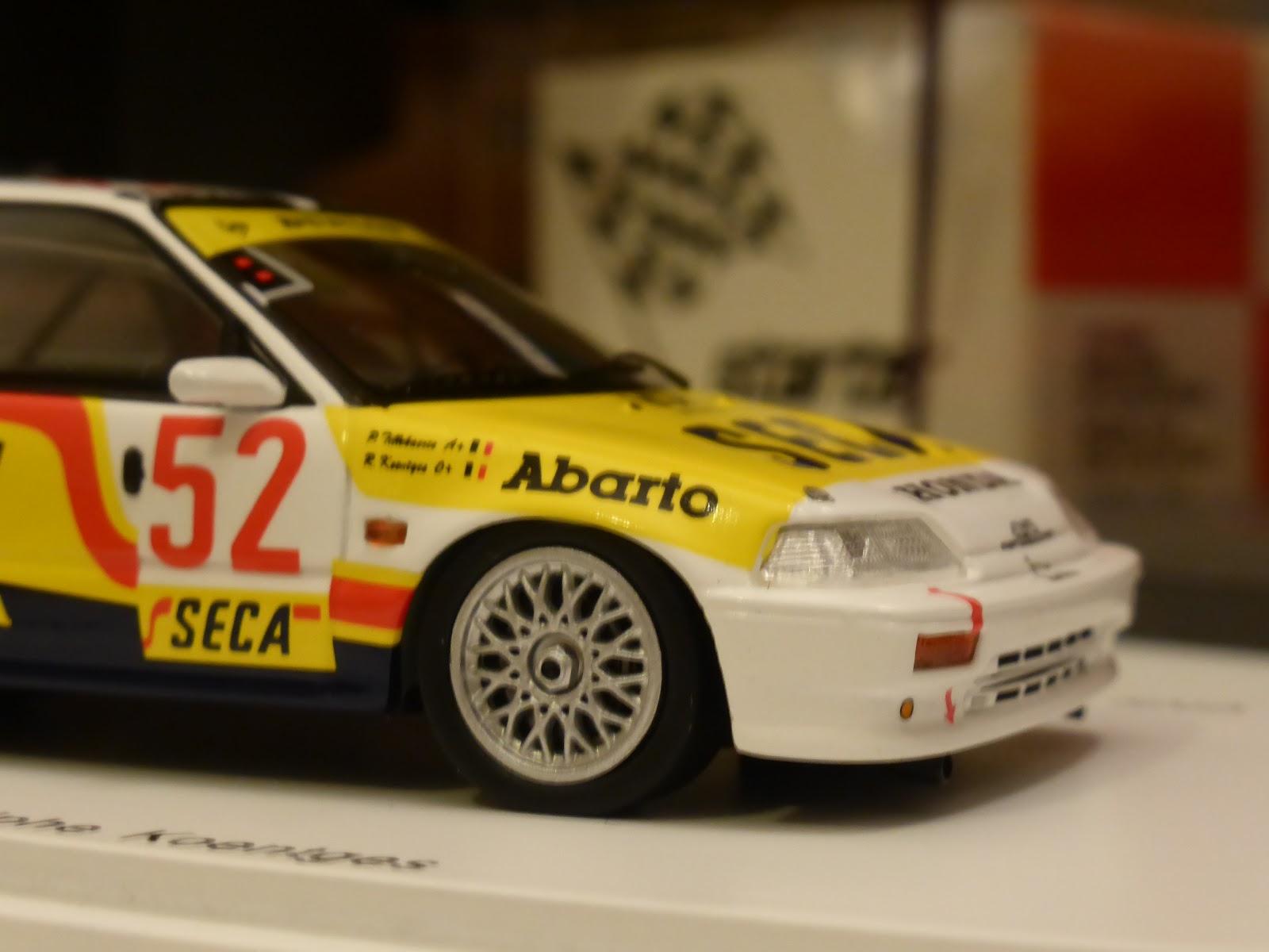 L\’idea, quindi è stata buona e l\’impegno profuso nella realizzazione di questo modello rivela un\’attenzione ai particolari messa ancora più in valore dalla validità della base, molto ben riuscita. Assetto, abitacolo, decorazione, tutto è negli standard di Spark. Difficile dire se per gli interni ci si sia basati su foto specifiche. Il sedile di un colore rosso vivo fa pensare che Spark avesse in mano della documentazione di questa particolare vettura (peccato come al solito per le cinture di sicurezza in decals). In corso d\’opera sono state corrette anche la posizione (da sinistra a destra) e la sezione (da ovale a cilindrica) del tubo di scarico. Ricordiamo che la versione prescelta corrisponde alla vettura che nel 1989 vinse il gruppo N della seconda divisione con Pascal Tillekaerts e Rodolphe Koentges. Dicevamo della 24 Ore con le turismo.