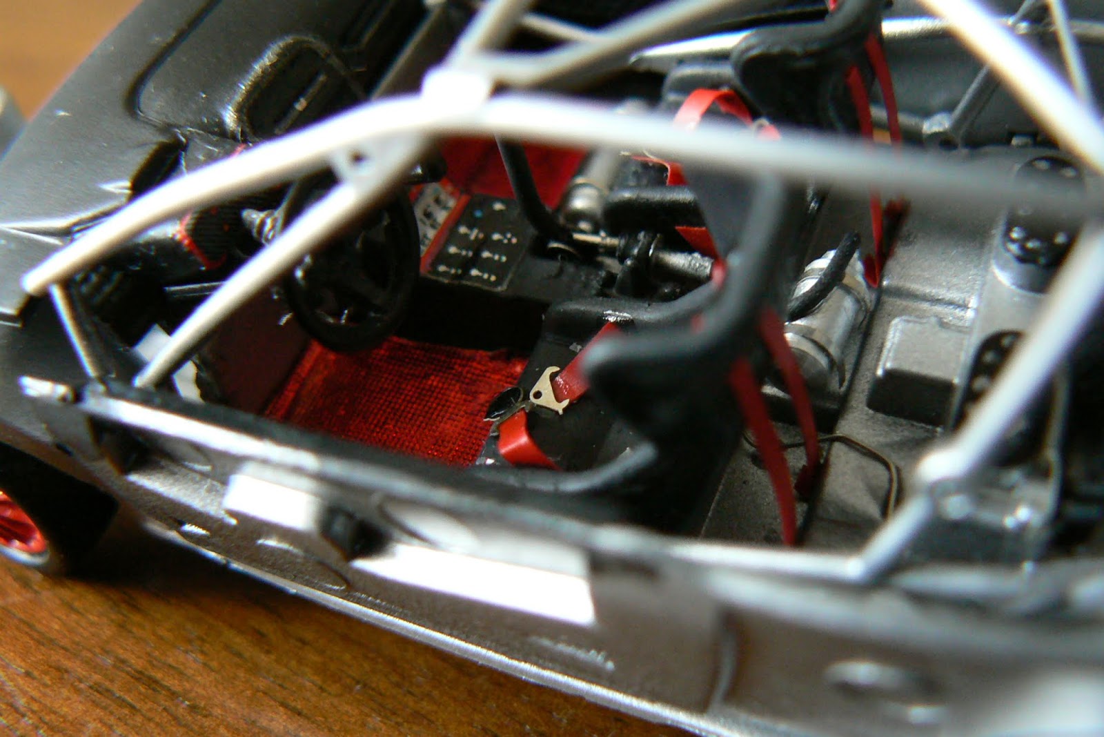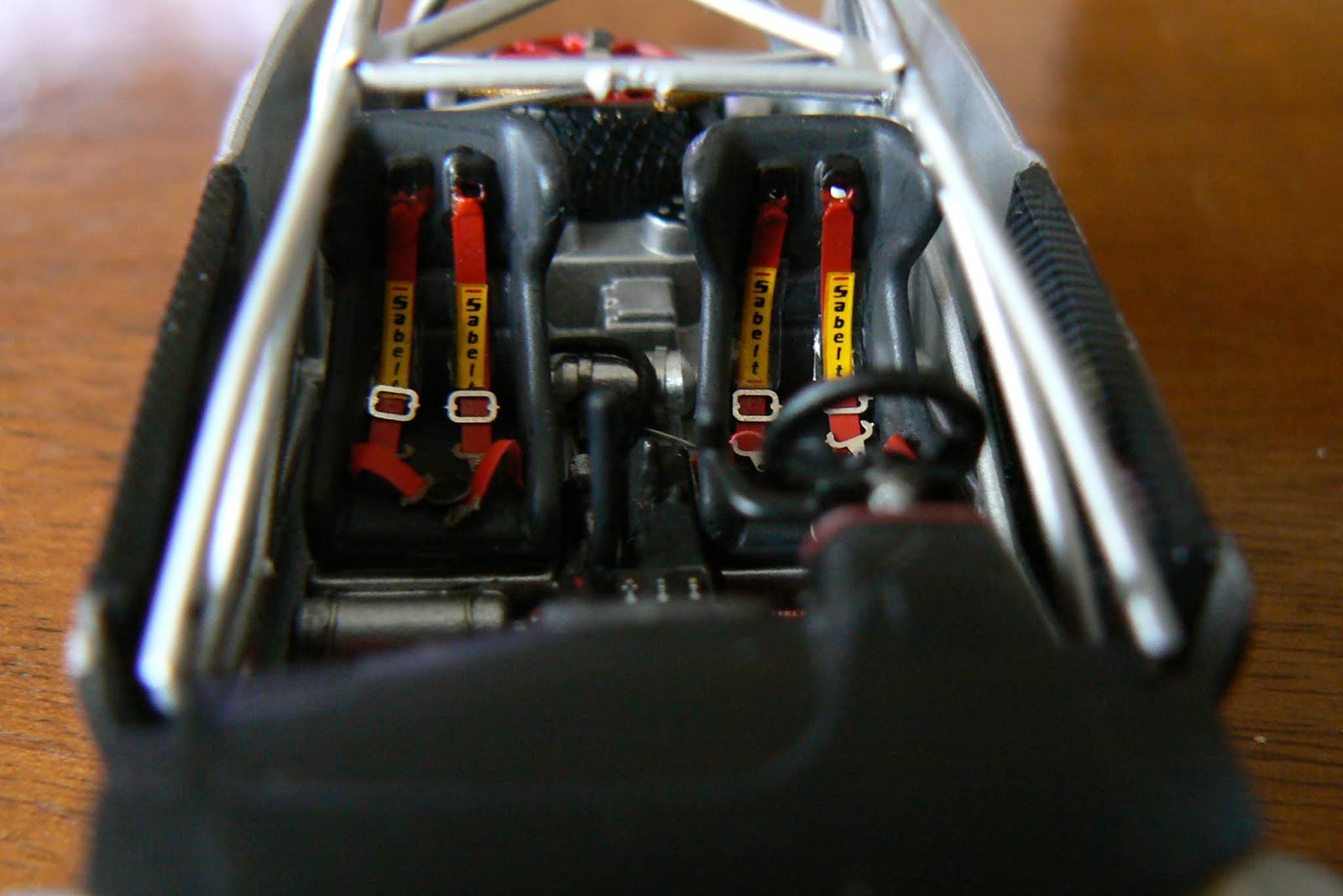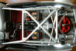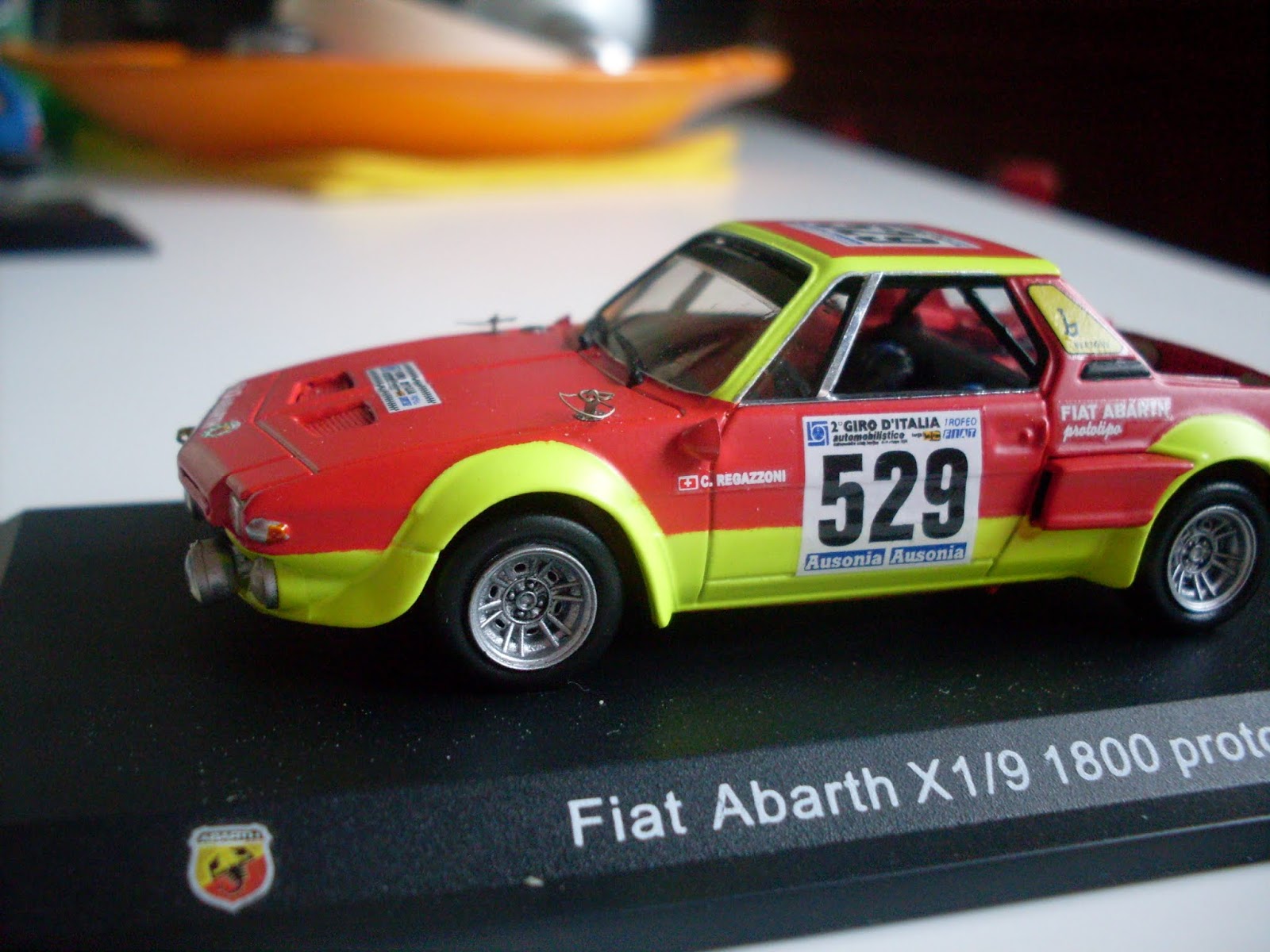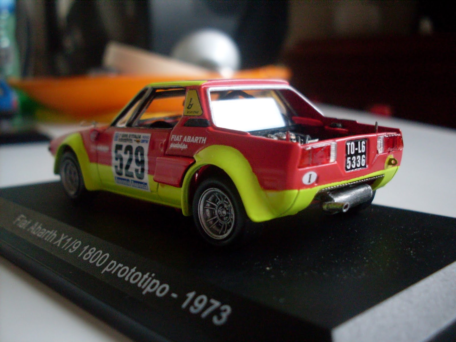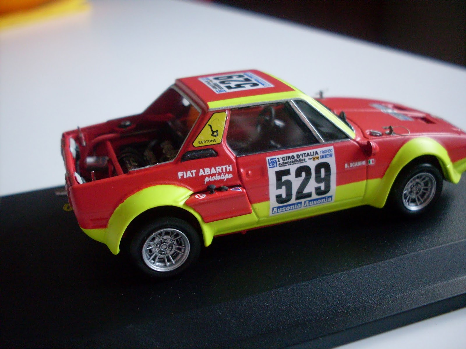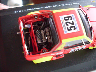 La seconda realizzazione si basa sul modello della Fiat Abarth X 1/9 Prototipo uscita in edicola qualche anno fa per la collezione Abarth della Hachette, si tratta della versione che partecipò al Giro d\’Italia con l\’equipaggio Regazzoni/Scabini, alla quale ho asportato il cofano posteriore per poter realizzare il motore con tutta la componentistica (bobine – tromboncini di aspirazione – pulegge e cinghia della distribuzione e le barre di irrobustimento della scocca”.