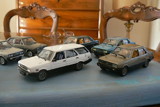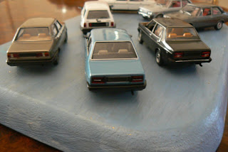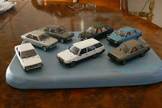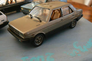 Per la seconda serie ho realizzato la 131 Mirafiori CL (grigio scuro metallizzato) partendo da una 131 della Ixo eseguendo i particolari e le rifiniture di tale allestimento come i paraurti in metallo della prima serie, mentre per la 131 Supermirafiori (azzurro metallizzato) ho anche in questo caso utilizzato una 131 della Ixo effettuando le rifiniture interne tipiche di questa versione. Infine, per la terza serie, ho realizzato la 131 Supermirafiori 2000 TC (bronzo metallizzato) partendo anche in questo caso dalla 131 della Ixo e modificando i paraurti anteriori e posteriori, creando i fascioni paracolpi laterali, realizzando la nuova calandra e modificando la coda con i nuovi fanali a sviluppo orizzontale, inoltre come per tutte ho rifinito gli interni come da specifiche dell\’allestimento. Stesse modifiche sono state operate sulla versione della 131 Familiare (bianca) della Ixo.