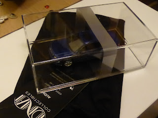 Già la confezione si distingue dal resto della produzione dei resincast per originalità e ricercatezza: una robusta scatola esterna in cartone contiene la vetrinetta integrale in plexiglass, avvolta da un panno nero che funge allo stesso tempo da protezione e da strumento di pulizia e lucidatura del modello. Una soluzione che ricorda piuttosto certi modelli in 1:18.