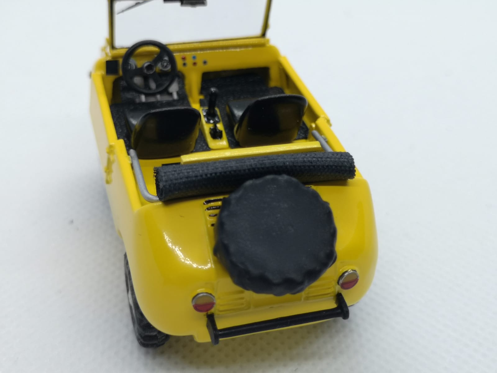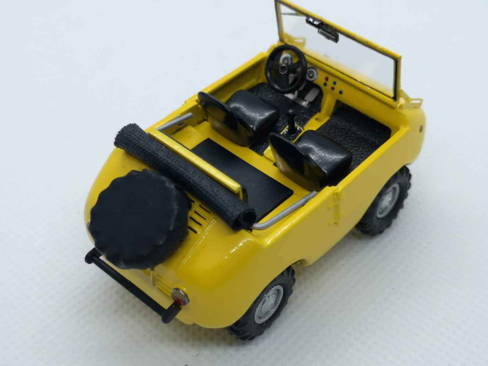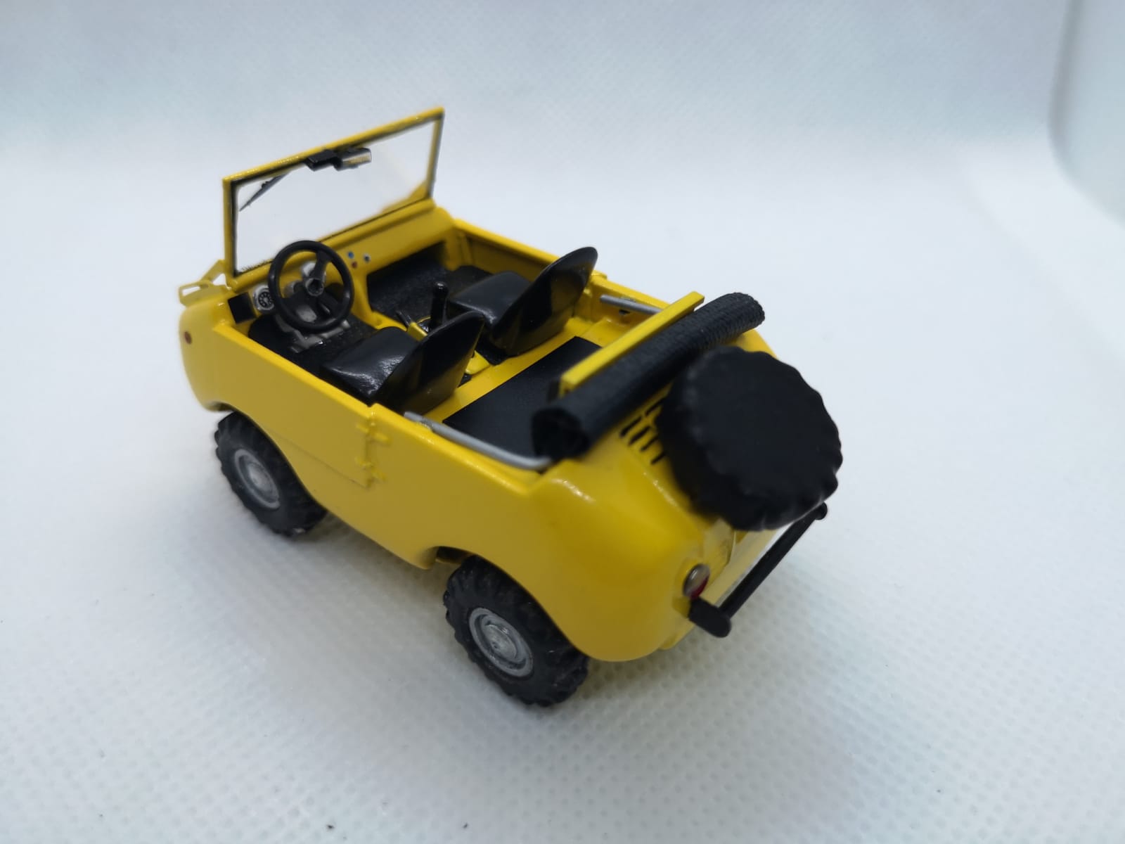 Ecco quindi che tutto è stato rivisto e migliorato: dal colore conforme all\’originale agli interni, dal parabrezza ai tergi, dal retrovisore alla riproduzione della ruota di scorta con la sua copertura (l\’originale era andato perduto, ragion per cui De Simone ha simulato la presenza della ruota stessa con la silhouette di una custodia nera). Per il momento manca la scritta Ranger che verrà stampata in decal. Il risultato generale è estremamente gradevole, a conferma che elaborazioni di questo tipo possono riservare molte soddisfazioni con un costo minimo e che gli uffici tecnici delle case di un tempo erano in grado di ottenere modelli dalle dimensioni corrette nonostante non potessero contare su tecnologie digitali e di tutte quelle facilitazioni che i produttori di oggi hanno sotto mano.