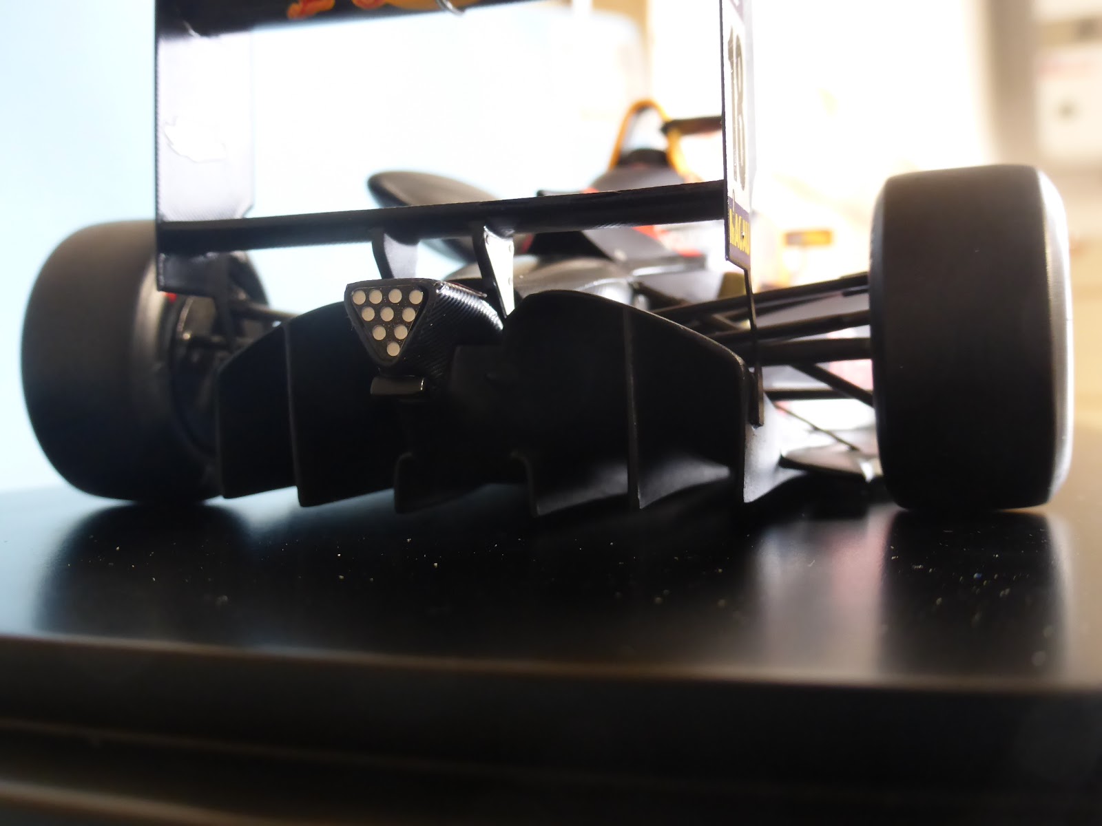 Cosa non trascurabile, l\’imballo è molto semplice ed efficace: non dimentichiamoci che questi modelli di notevole mole e complessità debbono affrontare lunghi viaggi nel corso della loro importazione, distribuzione e vendita. L\’impressione generale è quella di un\’incredibile pulizia: la finitura opaca non perdona e non si trova una macchia di colla o un\’imperfezione neanche a pagarla. Perfetta la resa delle superfici in carbonio e l\’allineamento delle varie sospensioni e appendici aerodinamiche è esente da ogni critica. Anche sulle monoposto in 1:18 il pilota costituisce una scelta che alcuni possono non condividere, ma in questo caso la finitura del figurino è molto convincente, con tanto di cinture di sicurezza in stoffa e fibbie fotoincise, visiera del casco realistica e quant\’altro. Molto bello il volante, completo dei vari comandi.
