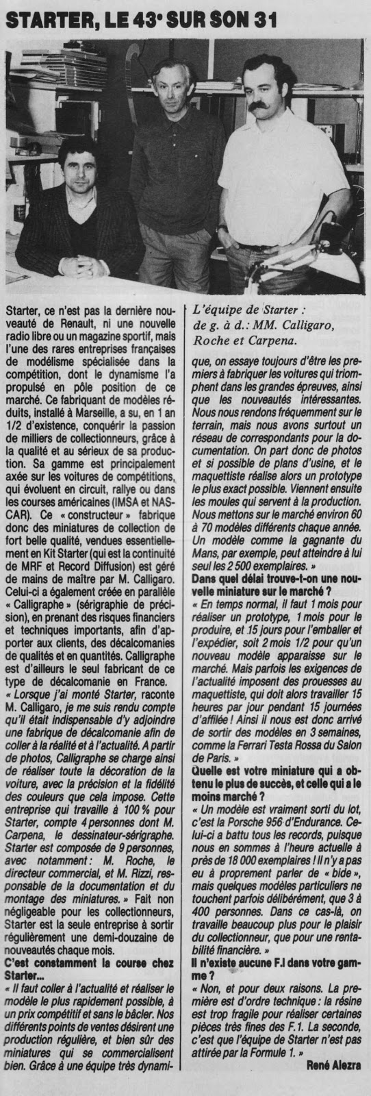 I lettori più assidui del blog ricorderanno alcuni articoli sulla storia e le fortune di alcune fra le più note case produttrici di modelli speciali, uscite ormai diversi anni fa a cura di Umberto Cattani e del sottoscritto. Fu una bella collaborazione, che ricordo con piacere, nella quale affrontammo diversi argomenti e nomi ormai mitici in questa nicchia dell\’1:43, da MRF a Record, da Starter a Provence Moulage. Fu fatto molto, ma molto ancora resterebbe da fare e non è escluso che si possa tornare su questi argomenti in un futuro speriamo non troppo lontano. Da quegli anni, Modelli Auto ha ripreso le pubblicazioni (nel 2014) e per fortuna le occasioni di scambio di idee e di opinioni con Umberto non sono mancate. Proprio qualche giorno fa, cercando la foto della 908/4 di Porsche Story (strettamente imparentata con le marche succitate) mi sono soffermato una mezz\’oretta a rileggere quegli articoli e sono orgoglioso che siano ospitati in questo blog. Oggi pomeriggio, senza esserci sentiti, una sorpresa: Umberto m\’invia la scansione di un articolo che non conoscevo, uscito su AutoHebdo nel numero del 23 maggio 1985. Si tratta di un\’intervista all\’équipe di Starter, composta da Calligaro, Roche e Carpena. Difficile resistere alla tentazione di tornare sull\’argomento con un\’aggiunta, ma come? La scansione del testo era troppo piccola per pubblicarla come immagine, mentre le foto erano leggibilissime e le pubblichiamo a parte.