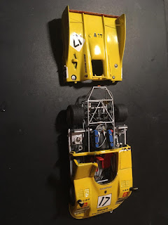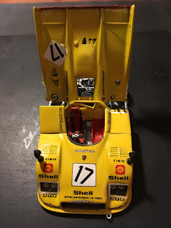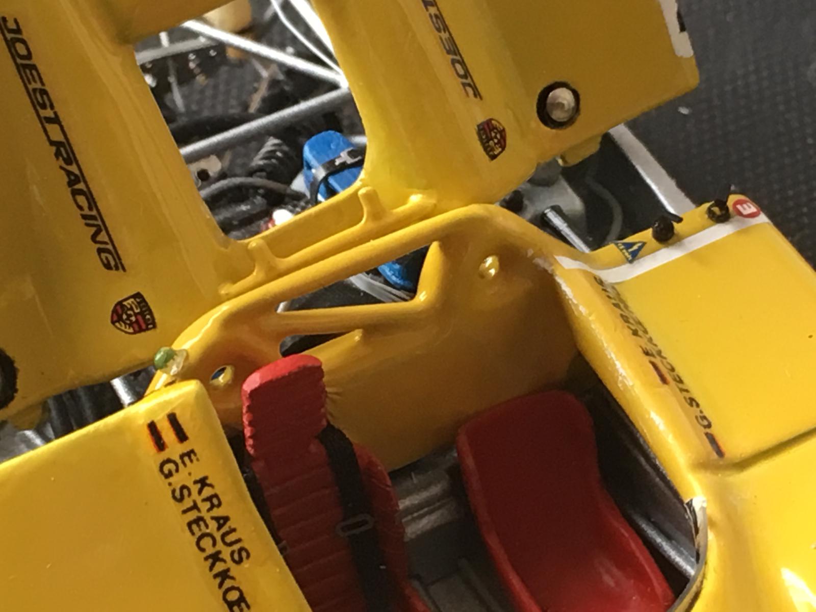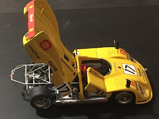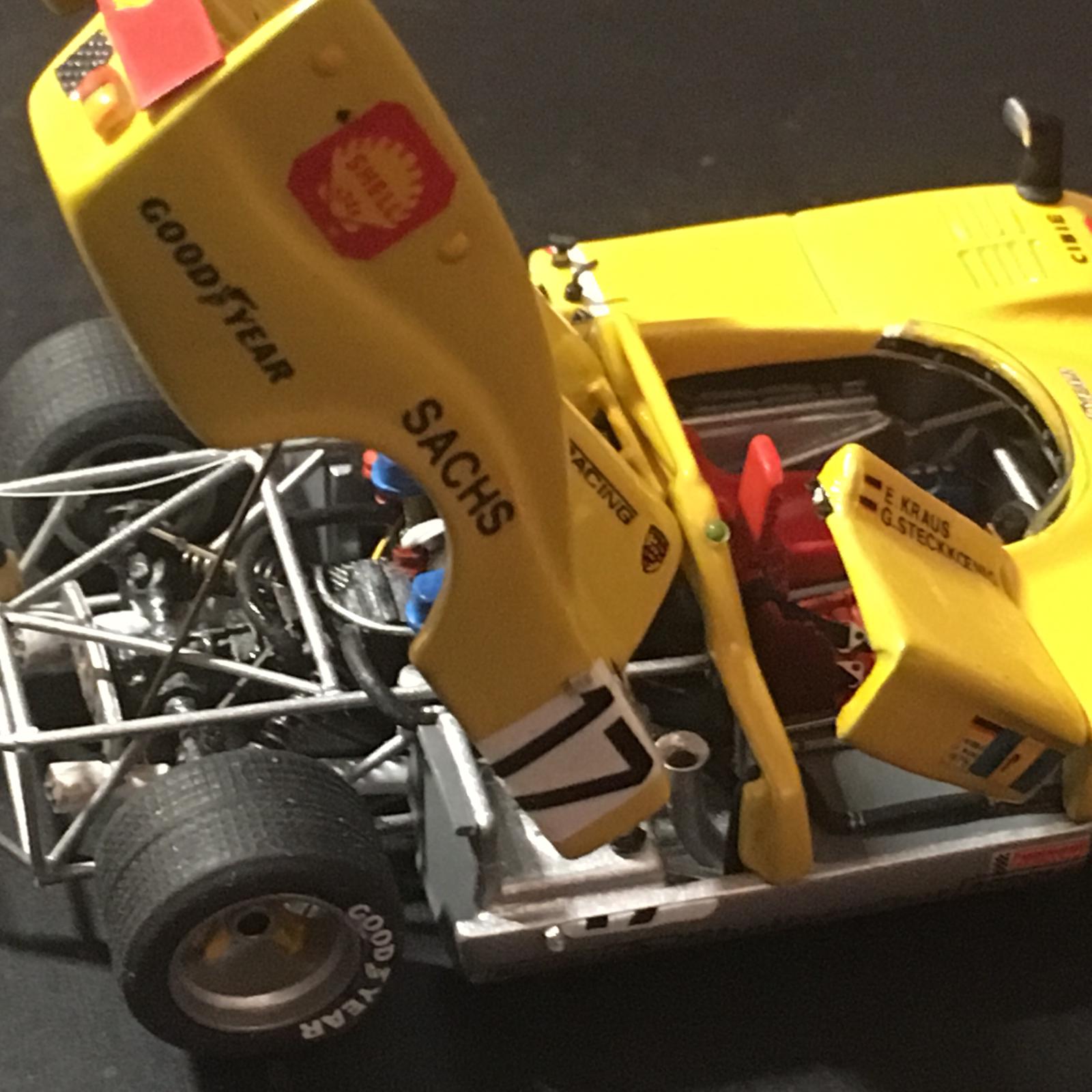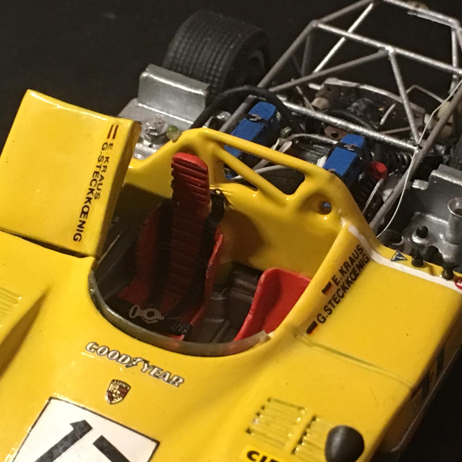 Rieccoci qui con le elaborazione di Massimo Martini, che ha portato a termine nei giorni scorsi l\’ennesima battaglia con i suoi rocchetti. Beh, in questo caso tanto rocchetti non erano, visto che si trattava già di una buona elaborazione fatta negli anni settanta su base Solido Porsche 917/10 Can-Am. Già all\’epoca, Martini aveva utilizzato il celebre modello Solido per ricavare la 908/3 coda lunga del 1976. In questi ultimi giorni, partendo da un modello che era particolarmente invecchiato, Martini ne ha approfittato per rifare tutto e renderlo apribile. Si è spinto anche a riprodurre una delle due portiere in posizione fissa aperta. La versione prescelta è quella classica della 24 Ore di Le Mans 1976 (piloti Kraus e Steckkoenig). La ricerca storica è stata molto precisa, tanto che sono saltati fuori alcuni particolari che erano sfuggiti anni fa a Spark quando riprodusse questo modello. Martini ha deciso di rendere il modello apribile, con dettagli completi del motore e dell\’abitacolo. E\’ stato fatto come sempre ampio uso di plasticard e di tanti altri materiali per l\’autocostruzione per tutta una varietà di dettagli.
