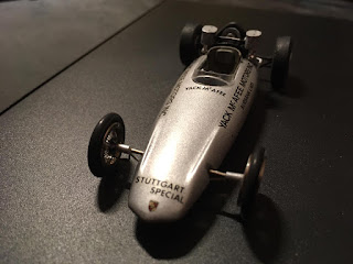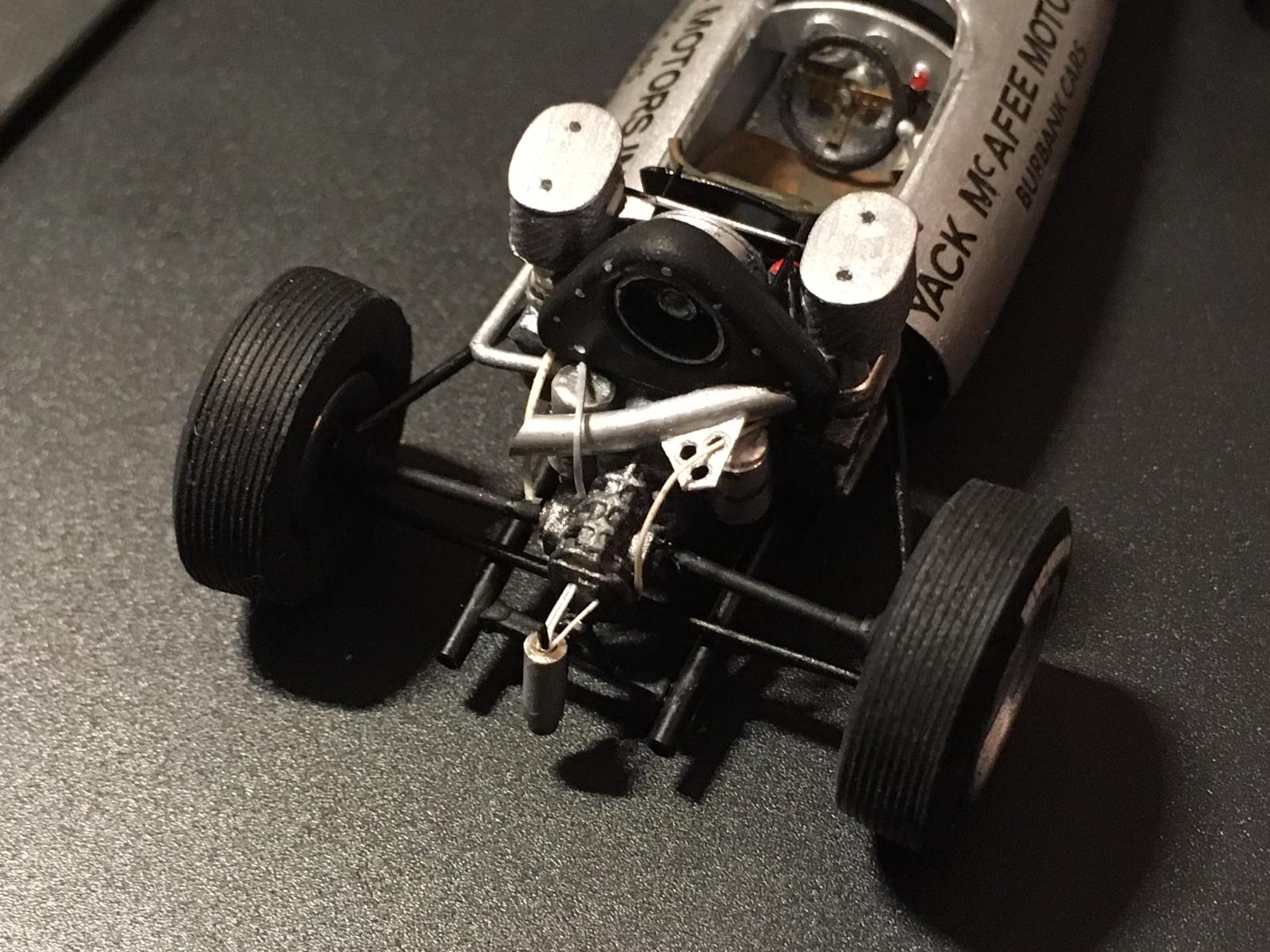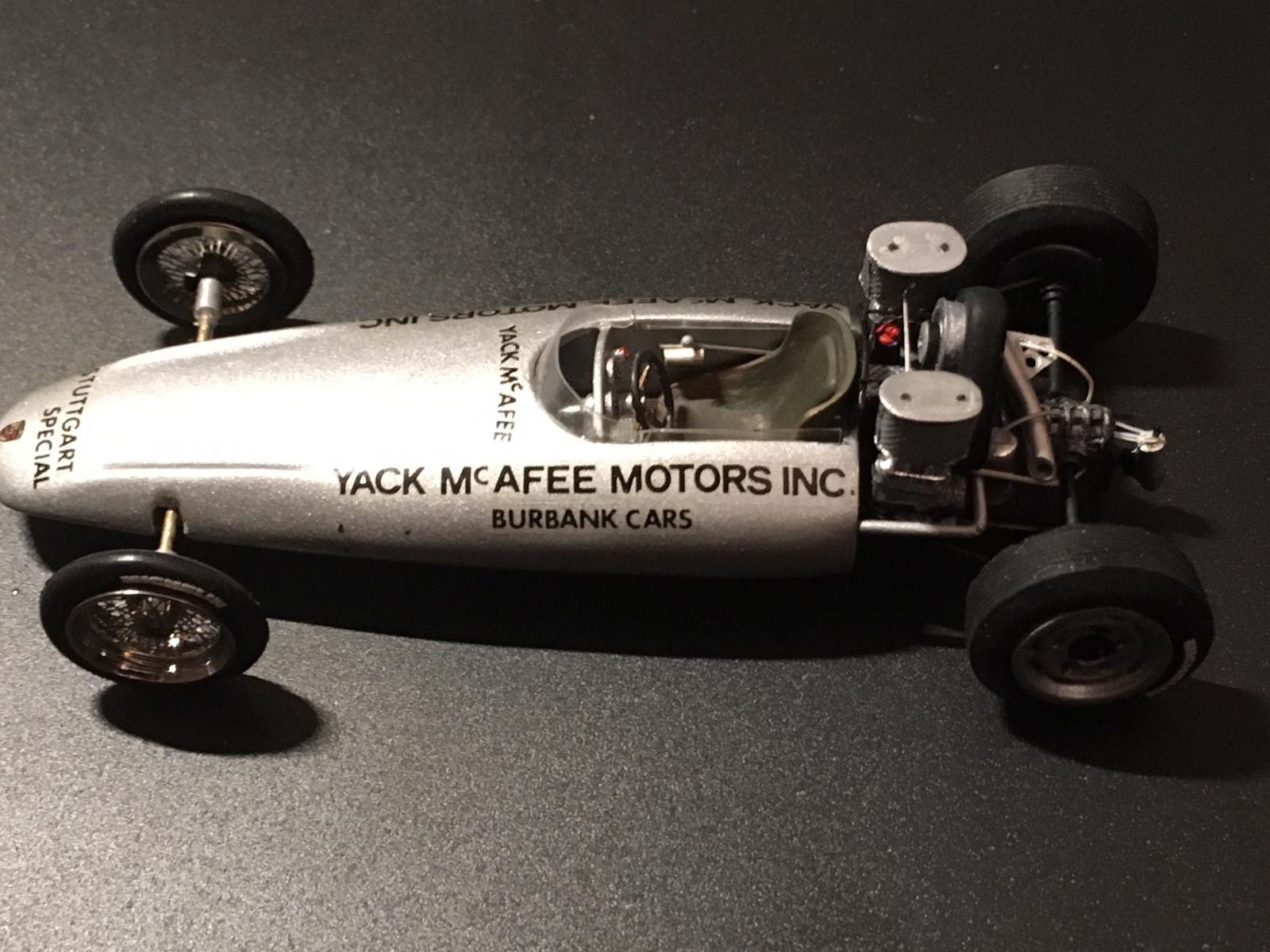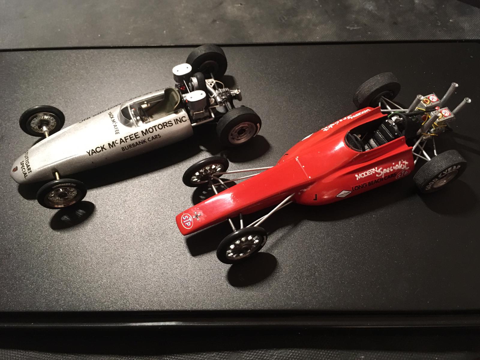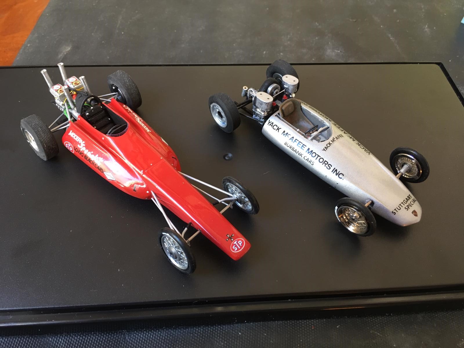 Pensavate che la battuta sul non c\’è due senza tre alla fine del più recente post sulle elaborazioni di Massimo Martini fosse casuale? Risposta: non lo era. In effetti, Martini ha completato da pochissimo una sorta di trilogia in 1:43, iniziata con l\’hot rod Canepa-Porsche del Pikes Peak, continuata con il dragster Modern Specialist e terminata giustappunto con questo terzo \”coso\”, che riproduce un altro dragster, ancora motorizzato Porsche e impiegato da McAfee (sì, quel McAfee che ha corso un po\’ con tutto) alla fine degli anni cinquanta. Il propulsore era un derivato 356, con caratteristiche diverse rispetto al Modern Specialist, che è invece più recente. Il modello è autocostruito (plasticard, stucco, eccetera) e in questa gallery pubblichiamo anche qualche immagine del lavoro nelle sue prime fasi. Accanto, potete vedere l\’altro dragster, il Modern Specialist.