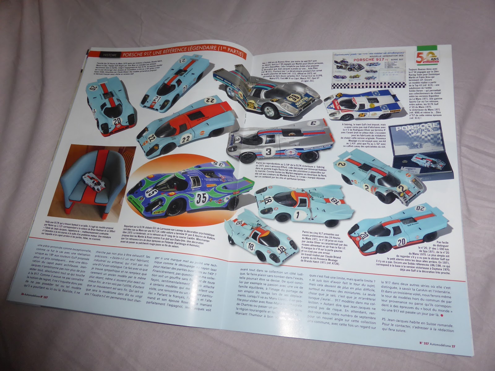 Il numero di giugno di Automodélisme è sempre quello incentrato sulla 24 Ore di Le Mans, e accompagna i collezionisti verso l\’evento più importante della stagione. E\’ quindi normale che i contenuti siano spesso legati alla gara della Sarthe. Quest\’anno si celebrano i cinquant\’anni della 917 e la redazione non si fa sfuggire l\’occasione dell\’anniversario. Lo fa però in maniera piuttosto superficiale, dettata dall\’inevitabile fretta di quando si debbono fare troppe cose in troppo poco tempo. Il focus viene orientato su una banalotta collezione di un tizio svizzero, che ci verrà propinata addirittura in tre puntate. La prima parte, uscita ora, verte sulle vetture più tradizionali, dal 1969 al 1971; la seconda sarà sulle partecipazioni Interserie e Can-Am, mentre la terza si concentrerà sulle stranezze. I modelli fotografati sono spesso bruttini e poco attuali, ma il collezionista in questione preferisce non sostituire le miniature non più attuali con altre storicamente meglio documentate. In questo numero non poteva mancare il diorama, anch\’esso ambientato sul tema Porsche 917 (e Le Mans).
