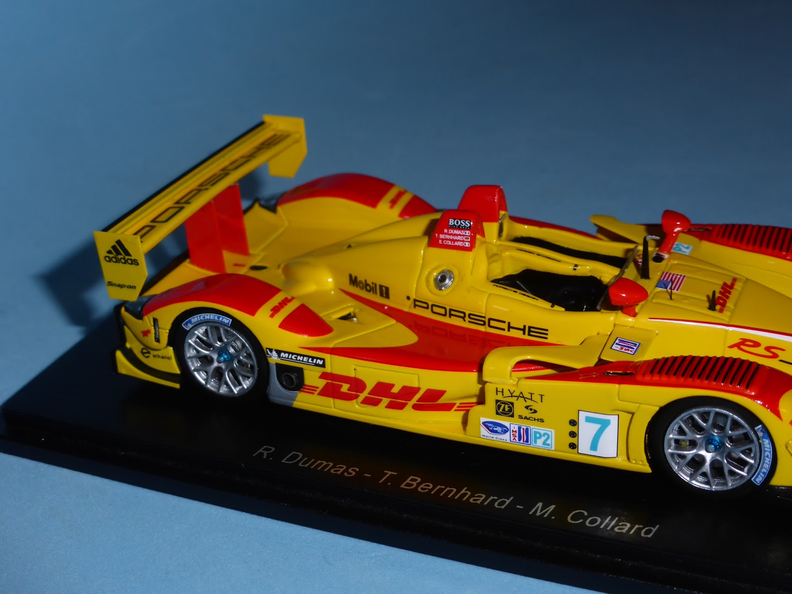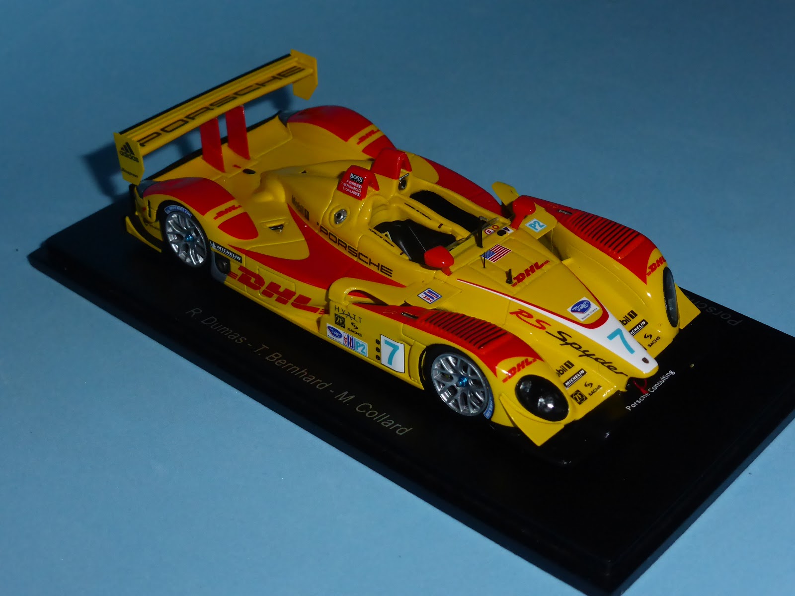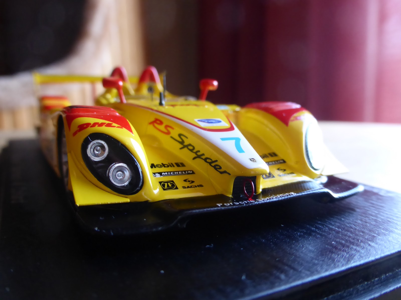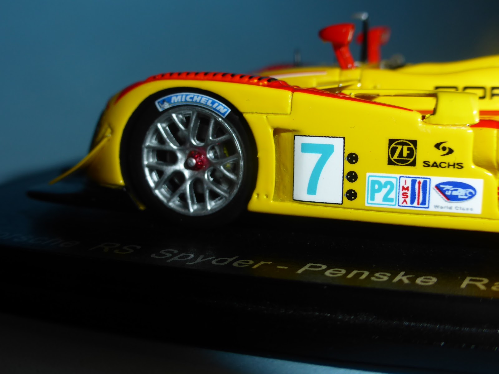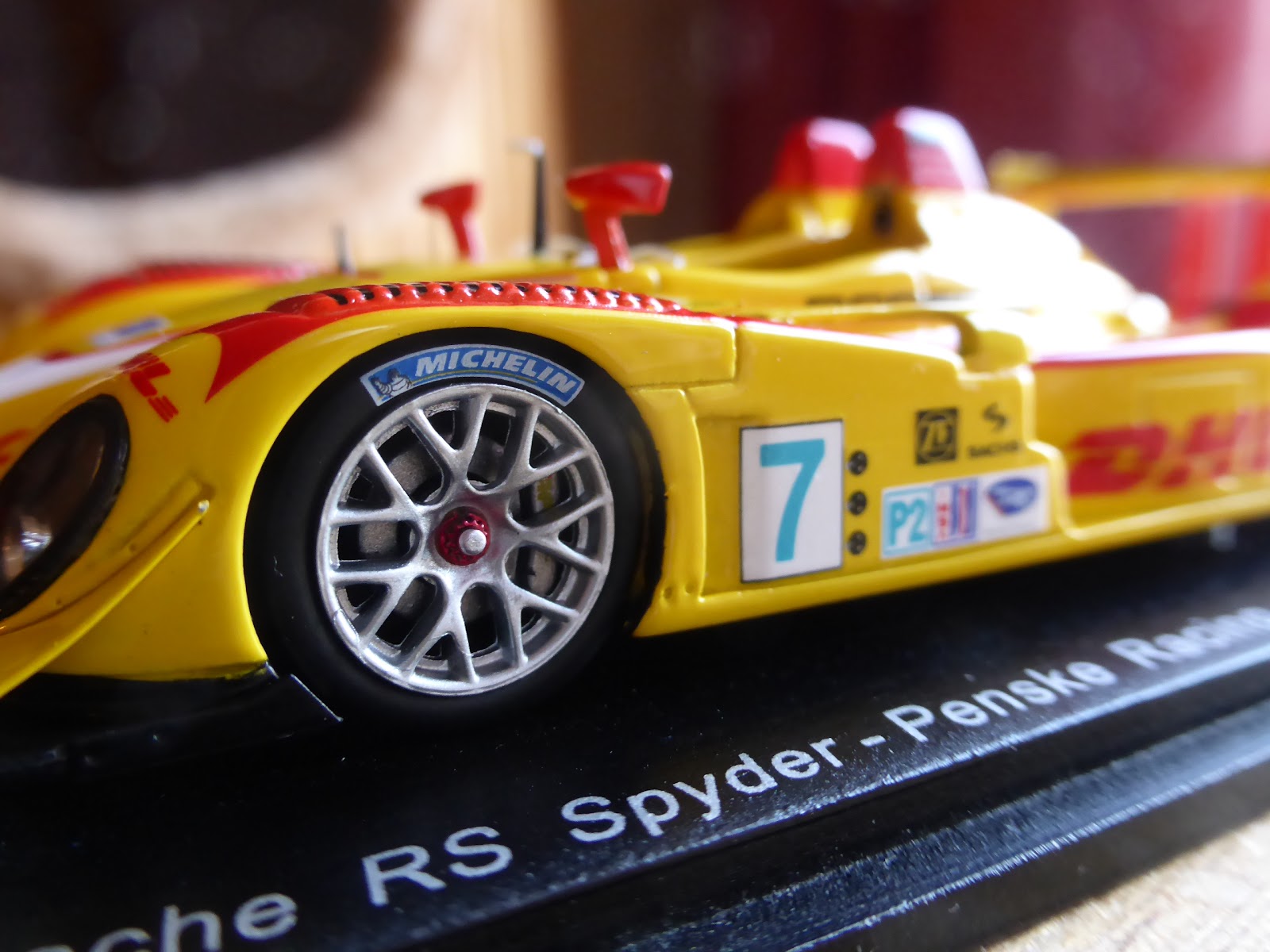 In occasione dell\’uscita del modello Spark 1:43, abbiamo rievocato nel thread precedente la vittoria della Porsche RS Spyder alla 12 Ore di Sebring 2008, Passiamo al modello. Come al solito la resina è il materiale prescelto. Ancora una volta mi pare che Spark dia il meglio di sé nelle vetture moderne, che sono meno soggette a soffrire di alcuni difetti cronici di questi modelli, vale a dire le decals stampate a grappoli in un solo film, ruote plasticose e qualche altro vezzo che non ci si decide a risolvere, fondamentalmente perché Spark non ha concorrenza e pensa (a ragione?) che nessuno più le darà noia a questi livelli. La vettura vincitrice a Sebring esce nella serie speciale della 12 Ore, col numero di catalogo 43SE08. Quasi contemporaneamente Spark ha commercializzato anche la vettura del 2007, campione dell\’American Le Mans Series con Dumas e Bernhard (catalogo S4185). Non c\’è praticamente differenza fra una versione e l\’altra, ma scegliamo per questa gallery la vettura di Sebring 2008. La RS Spyder di Spark l\’avevamo già vista in altre versioni. Il modello è verniciato perfettamente e la posa decals è esente da qualsiasi critica. Straordinaria la finezza degli stampi, nella migliore tradizione di Starter e Provence Moulage. I cerchi in questo caso possono tranquillamente permettersi di essere in plastica, vista la verniciature in grigio satinato che non tradisce il materiale d\’origine.
