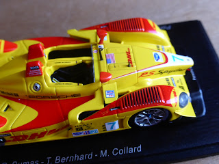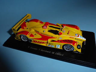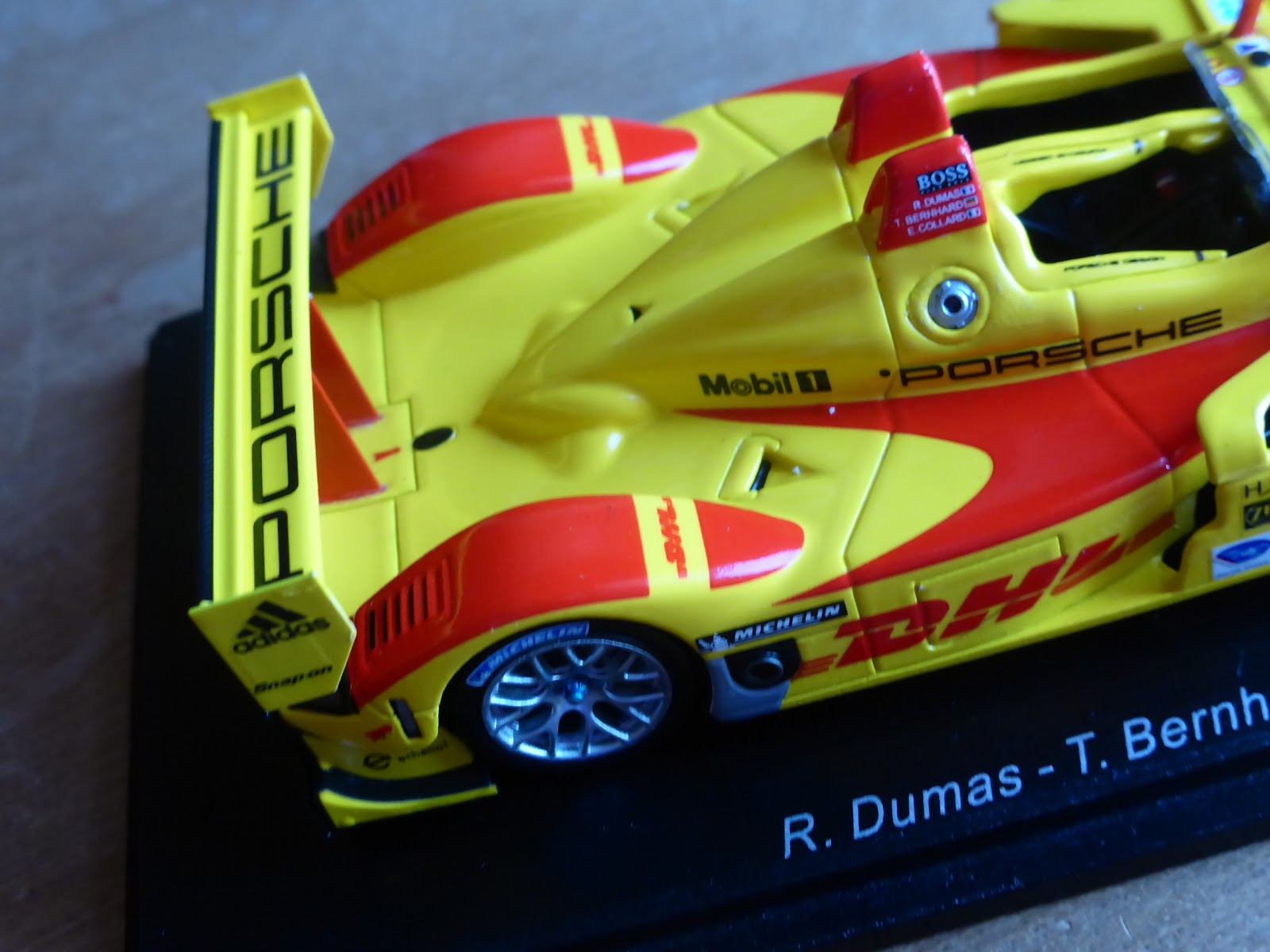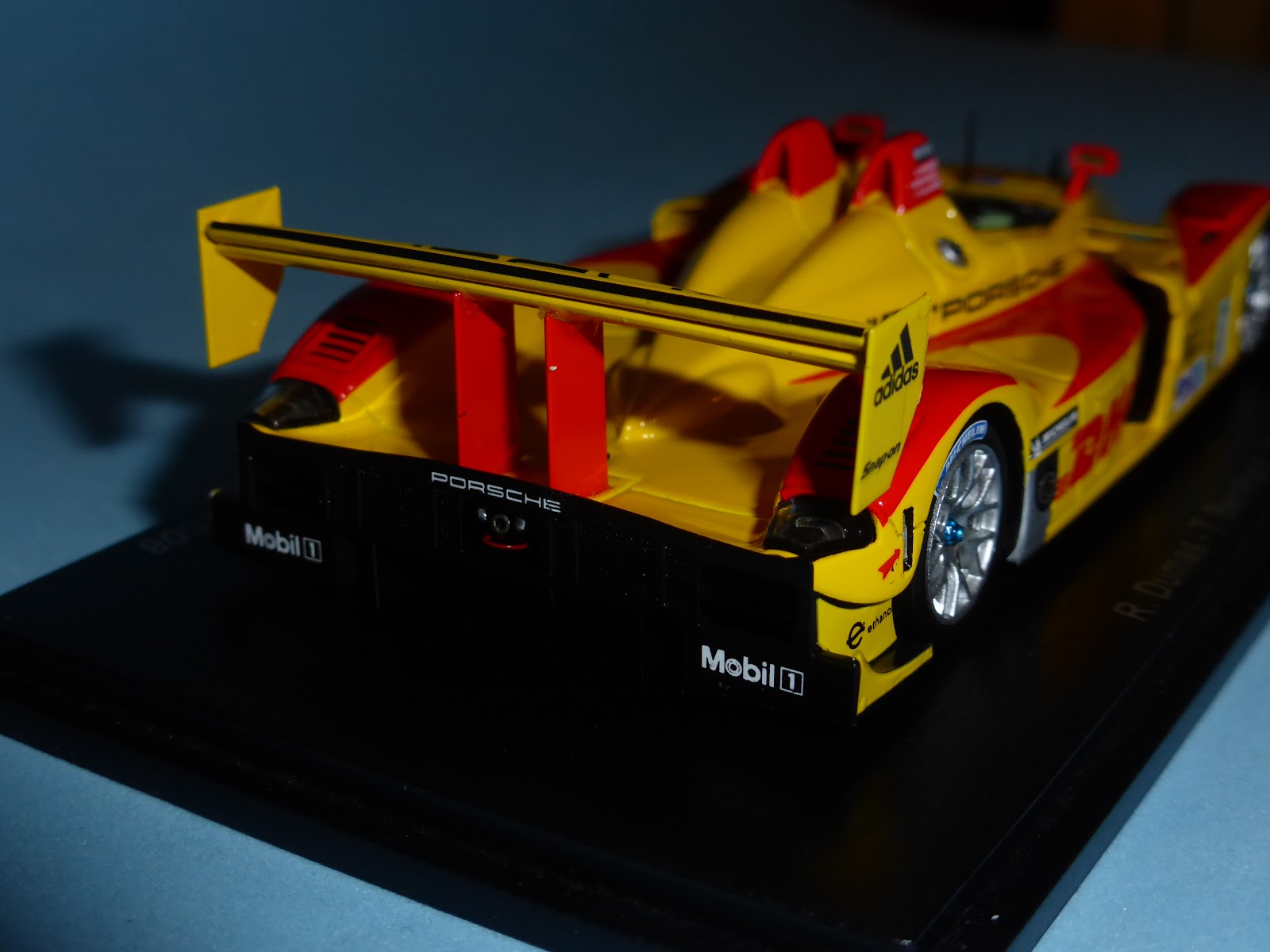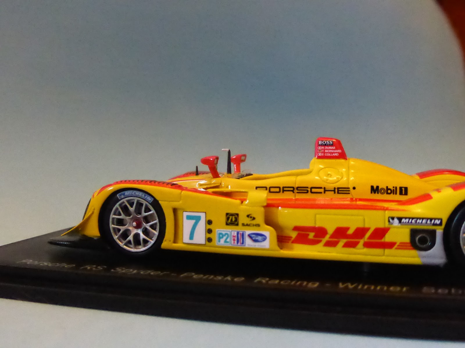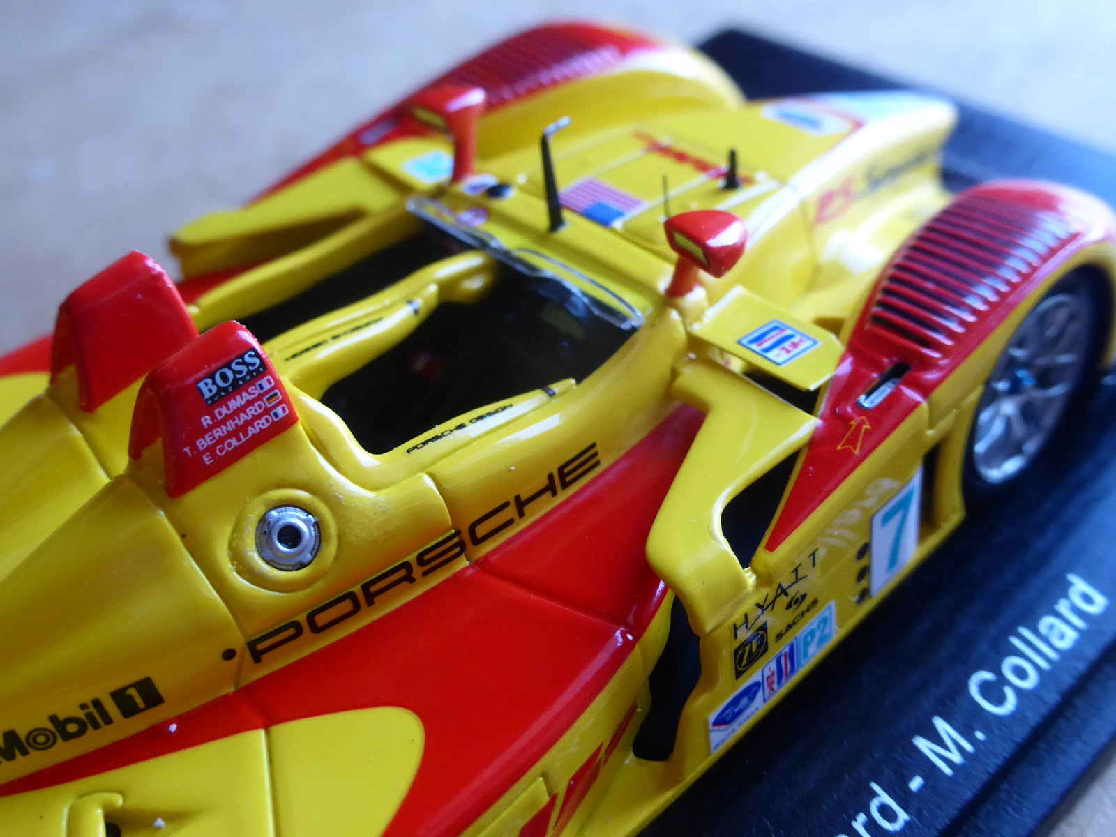 In occasione dell\’uscita del modello Spark 1:43, abbiamo rievocato nel thread precedente la vittoria della Porsche RS Spyder alla 12 Ore di Sebring 2008, Passiamo al modello. Come al solito la resina è il materiale prescelto. Ancora una volta mi pare che Spark dia il meglio di sé nelle vetture moderne, che sono meno soggette a soffrire di alcuni difetti cronici di questi modelli, vale a dire le decals stampate a grappoli in un solo film, ruote plasticose e qualche altro vezzo che non ci si decide a risolvere, fondamentalmente perché Spark non ha concorrenza e pensa (a ragione?) che nessuno più le darà noia a questi livelli. La vettura vincitrice a Sebring esce nella serie speciale della 12 Ore, col numero di catalogo 43SE08. Quasi contemporaneamente Spark ha commercializzato anche la vettura del 2007, campione dell\’American Le Mans Series con Dumas e Bernhard (catalogo S4185). Non c\’è praticamente differenza fra una versione e l\’altra, ma scegliamo per questa gallery la vettura di Sebring 2008. La RS Spyder di Spark l\’avevamo già vista in altre versioni. Il modello è verniciato perfettamente e la posa decals è esente da qualsiasi critica. Straordinaria la finezza degli stampi, nella migliore tradizione di Starter e Provence Moulage. I cerchi in questo caso possono tranquillamente permettersi di essere in plastica, vista la verniciature in grigio satinato che non tradisce il materiale d\’origine.