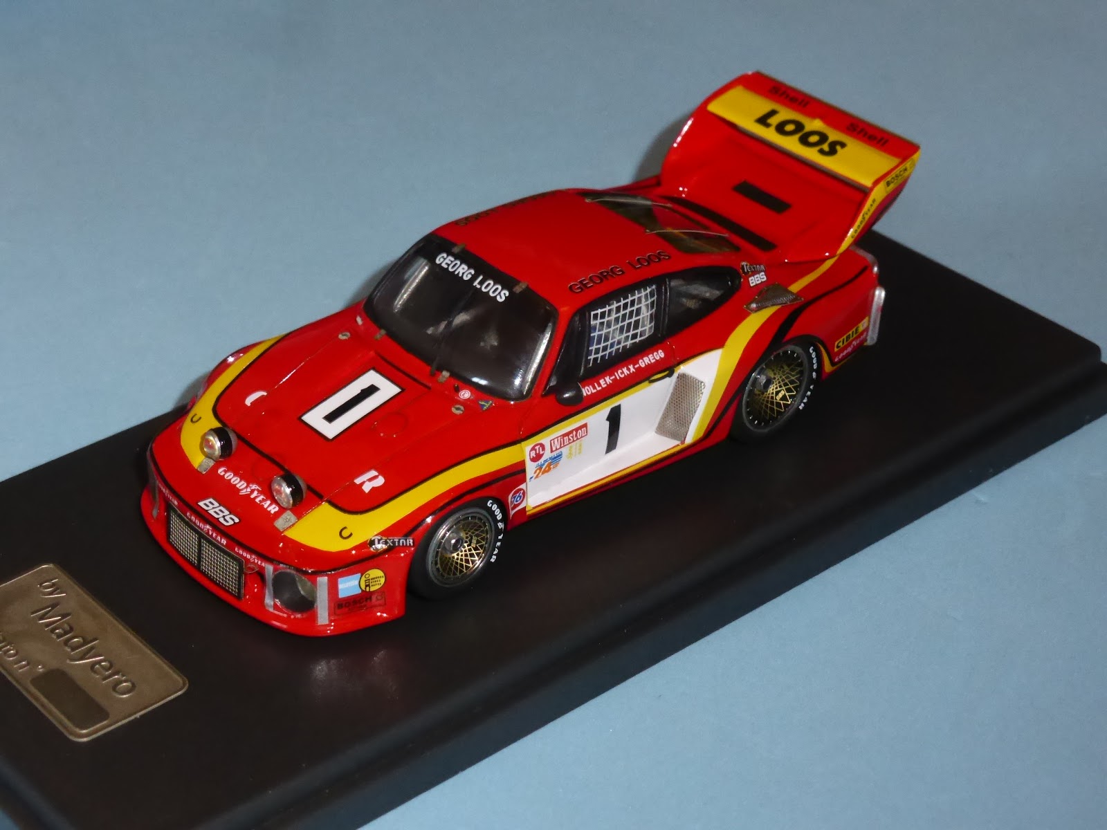 Questa serie limitatissima di Porsche 935 montate da Madyero è già esaurita e non ci saranno altre edizioni, ma vale lo stesso la pena presentarla per l\’interesse storico. Alla 24 Ore di Daytona del 1979 il team di Georg Loos iscrisse due 935/77A con dichiarate ambizioni di vittoria: il supporto fornito direttamente dalla casa madre e lo schieramento dei piloti permetteva lecite speranze, nonostante una concorrenza molto agguerrita, che poteva contare su altre 935 molto ben preparate negli Stati Uniti e in Europa. La vettura numero 1 venne iscritta per Wollek/Ickx/Gregg, mentre la numero 2 era stata riservata sempre allo stesso Wollek con Schurti e Fitzpatrick. Dopo un\’ottima qualifica (secondo posto per la 2, terzo posto per la 1), le auto dovettero abbandonare per la stessa causa: rottura delle valvole del motore, lasciando la vittoria alla 935 del team Interscope. Madyero ha riprodotto per il momento la numero 1 ed è probabile che in un futuro sarà approntata anche una piccola serie della numero 2.