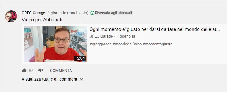 Voglio dire che la fama è ben meritata e non era necessariamente il fine principale del canale di Greg. Essa è venuta in un secondo momento; magari presto, ma è arrivata in virtù dell\’originalità e della vivacità degli interventi. Era quindi l\’ora di monetizzare, e dal primo gennaio il canale Youtube del Greg presenta l\’opzione di abbonarsi a dei contenuti criptati: per € 2,99 o € 4,99 al mese (dipende dal livello di abbonamento) è possibile interagire ancora meglio col titolare del canale e guardare contenuti riservati ai soli iscritti. Resteranno i video di stampo abituale, che Greg continuerà a mettere a disposizione di tutti. In un paio di presentazioni, Greg ha descritto con chiarezza di particolari la sua futura linea editoriale (chiamiamola così). E\’ una scelta che condivido in pieno, a dispetto di chi ha gridato alla speculazione, allo sfruttamento degli utenti, all\’ingiustizia nei confronti di chi l\’aveva sempre seguito fin dall\’inizio. Ebbene, vi piacciono certi filmati? Costa tempo e fatica farli; costa tempo parlare ogni giorni, trovare nuovi argomenti, e l\’esperienza accumulata nel corso di una vita non sempre è etico metterla a disposizione di tutti gratuitamente. Grazie agli abbonamenti sarà possibile a Greg Garage di muoversi con più agio e magari di fare delle cose che i migliaia di follower pretendevano senza sganciare un euro, perché Internet deve essere gratuito.