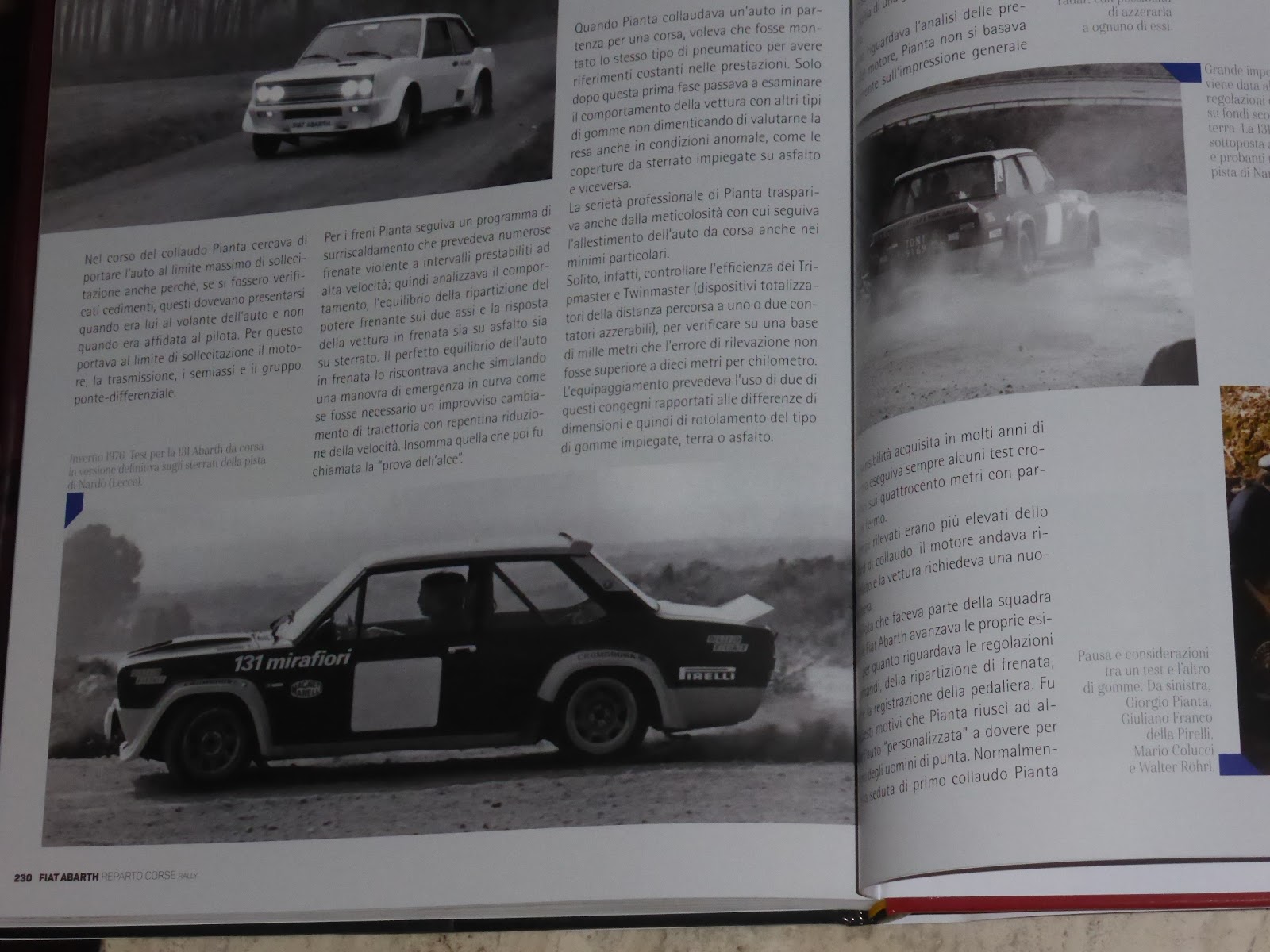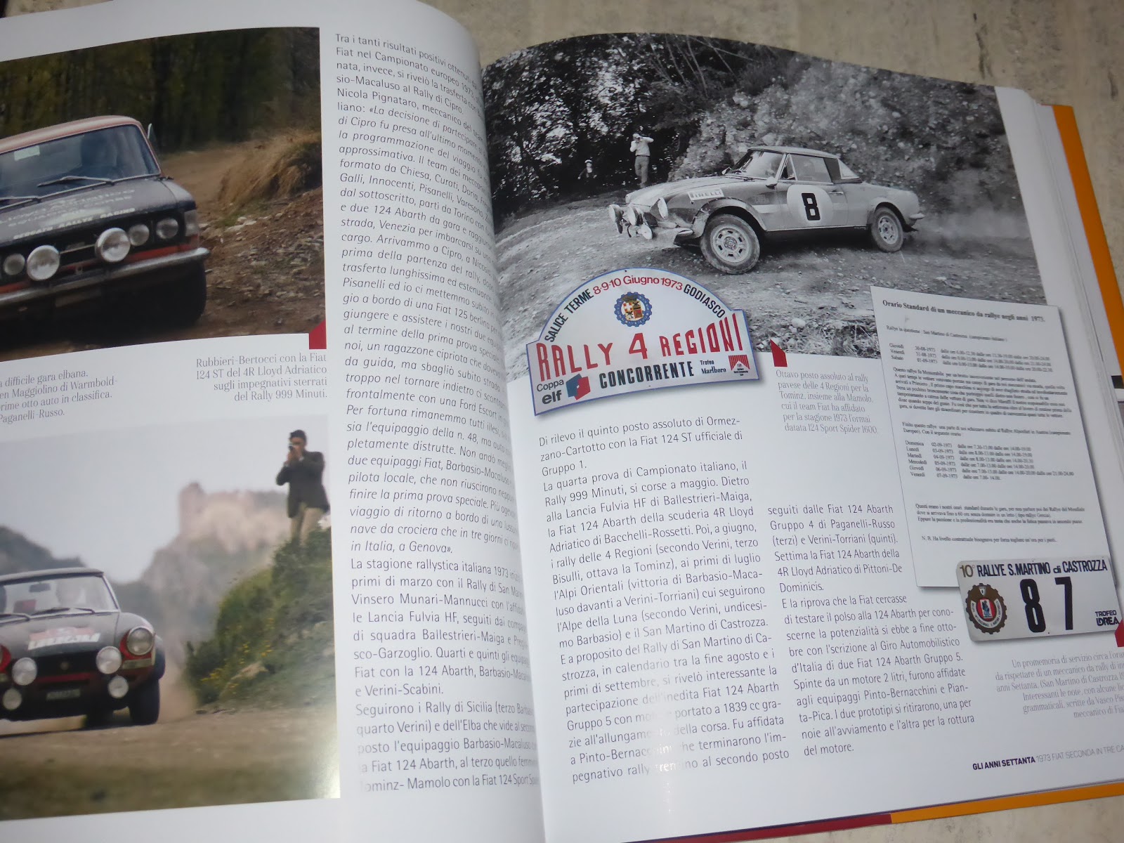 Il libro di Sanfront merita tempo e approfondimento. Con 244 pagine è un volume abbastanza imponente, ma non dà subito l\’idea della sua importanza e della sua qualità. I testi, a una prima occhiata, sembrano un po\’ poveri, e le foto, chissà perché non riescono a imporsi più di tanto. Poi scatta una molla: lo si riprende in mano, lo si sfoglia di nuovo, per la seconda, la terza, la quarta volta e allora lì, poco a poco, il libro inizia a rivelare i propri meriti, che sono tanti. A una cronologia anno per anno seguono i ritratti tecnici delle varie vetture utilizzate: Fiat 124 Sport Spider e Abarth, X1/9 Prototipo, 131 Abarth, ossia i mezzi impiegati ufficialmente nelle varie competizioni, incluse gare non propriamente da classificare come rally quali il Giro d\’Italia o il Tour de France Auto.