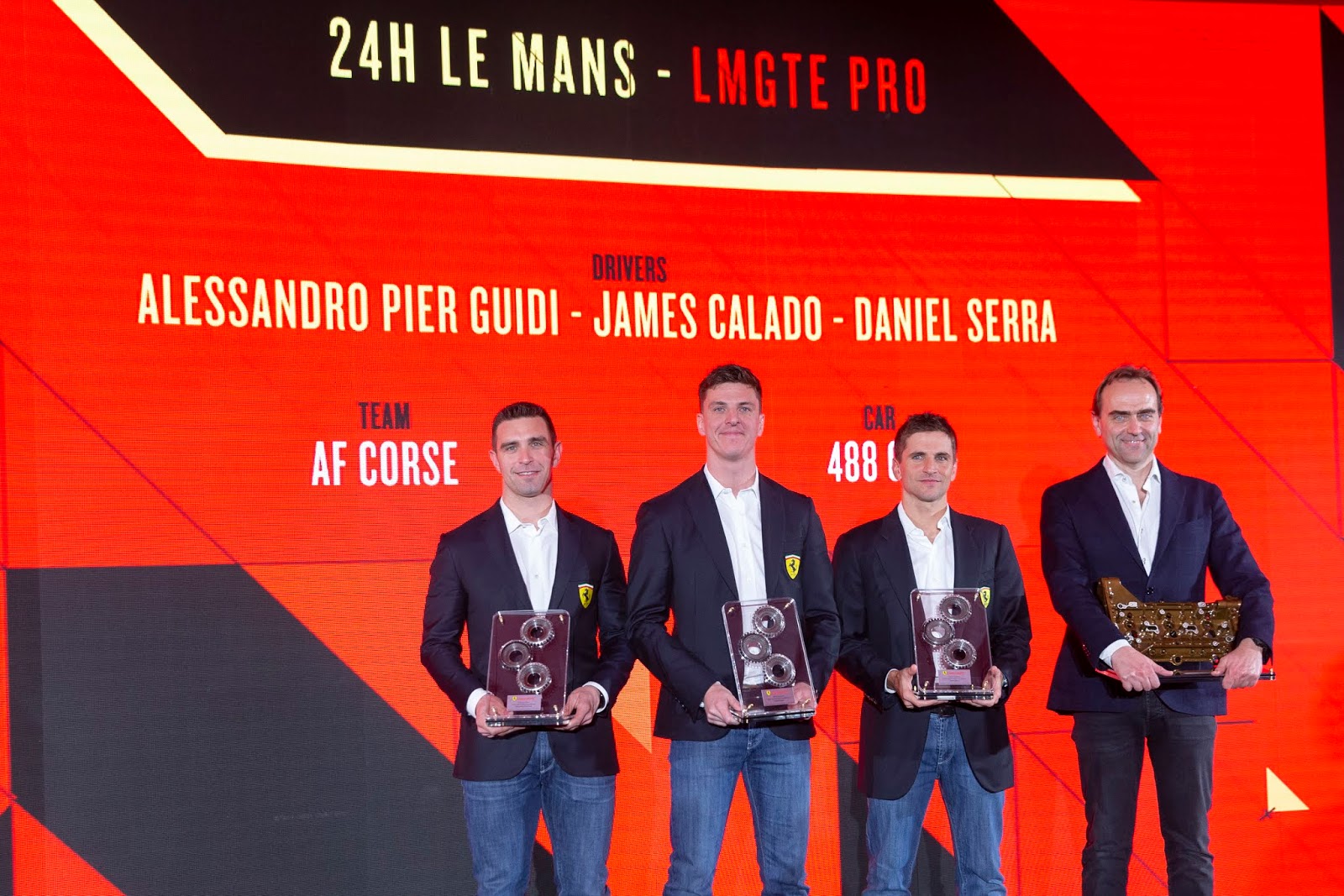 In entrambi i casi, la presenza costante sul palco è stata quella dei tre piloti ufficiali, Alessandro Pier Guidi, James Calado e Daniel Serra, cui si sono affiancati Giuseppe Risi, al quale è stato tributato un lungo e caloroso applauso da tutti i presenti per il successo sul tracciato di Road Atlanta, e Amato Ferrari che ha ringraziato commosso sul palco tutti gli uomini che hanno permesso di conquistare la trentaseiesima vittoria nella gara endurance più importante del mondo.