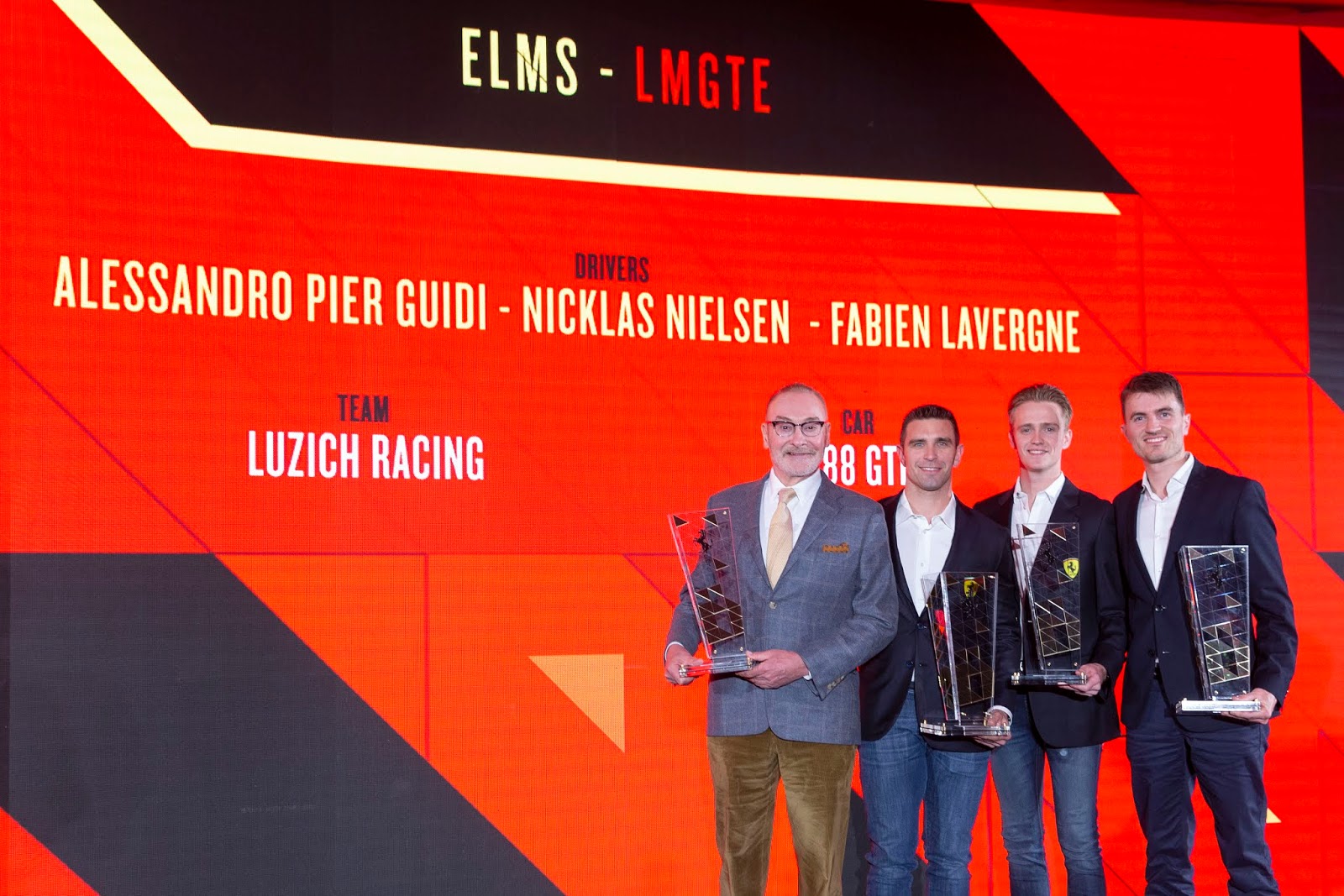 Serie internazionali. La premiazione dei vincitori dei campionati internazionali ha permesso la giusta acclamazione per Luzich Racing, trionfatore nella European Le Mans Series con quattro successi in sette gare con Alessandro Pier Guidi, Nicklas Nielsen e Fabien Lavergne, e per Toni Vilander che, smessi temporaneamente i panni del presentatore, ha ricevuto il riconoscimento per una stagione da dominatore nel Blancpain World Challenge America. Per il finlandese e il team R. Ferri Motorsport si è trattato del secondo successo consecutivo nella serie SRO. Sul palco anche Andrea Bertolini e Louis Machiels che si sono aggiudicati il Blancpain GT World Challenge Europe nella classe Pro-Am al volante della 488 GT3 di AF Corse che hanno voluto dividere questo momento con il loro storico compagno Niek Hommerson. Premiati anche Florian Scholze e Wolfgang Triller per il titolo nella classe Am conquistato con HB Racing nella stessa serie, così come Stephen Earle, al terzo trionfo consecutivo nella classe Iron nel Blancpain GT Sports Club.