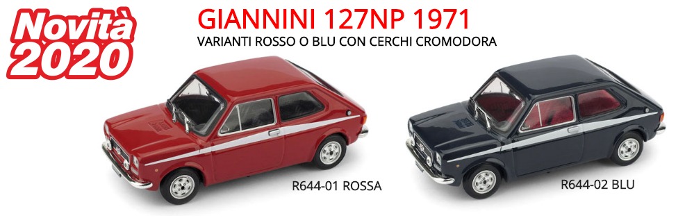 Fra i modelli programmati da Brumm per il 2020 figura la Fiat 127 NP Giannini del 1971. La marca italiana sfrutta così al meglio lo stampo della 127, modello uscito ormai diversi anni fa ma che può essere utilizzato ancora per delle configurazioni interessanti e semplici da realizzare come appunto la NP, che sarà disponibile in due colori, rosso (R644-1) e blu (R644-2). Il modello avrà i caratteristici antinebbia della versione Giannini, i vari fregi e i cerchi speciali Cromodora. Non si può parlare di novità assoluta (Brumm non presenta un nuovo stampo proprio dai tempi della 127 standard), ma sicuramente si tratta di un\’uscita interessante per gli appassionati dell\’automobilismo degli anni settanta. Non è la prima volta che Brumm si occupa delle Giannini: basti pensare alle varie versioni su base Fiat 500 viste nel corso degli anni, fra cui la 500 TV, la 590 GT Vallelunga o la 590 GTR realizzata per De Agostini.