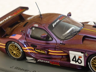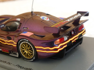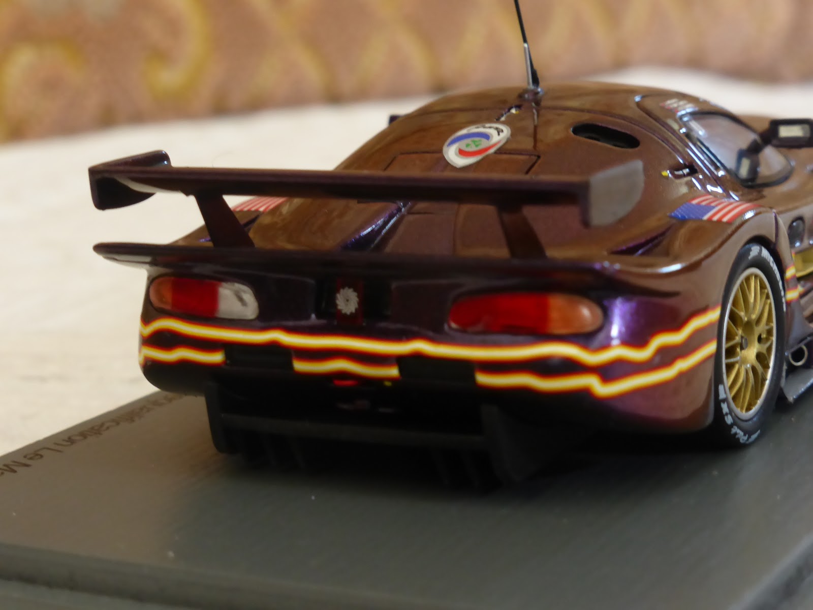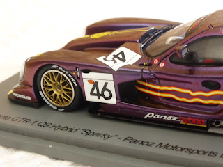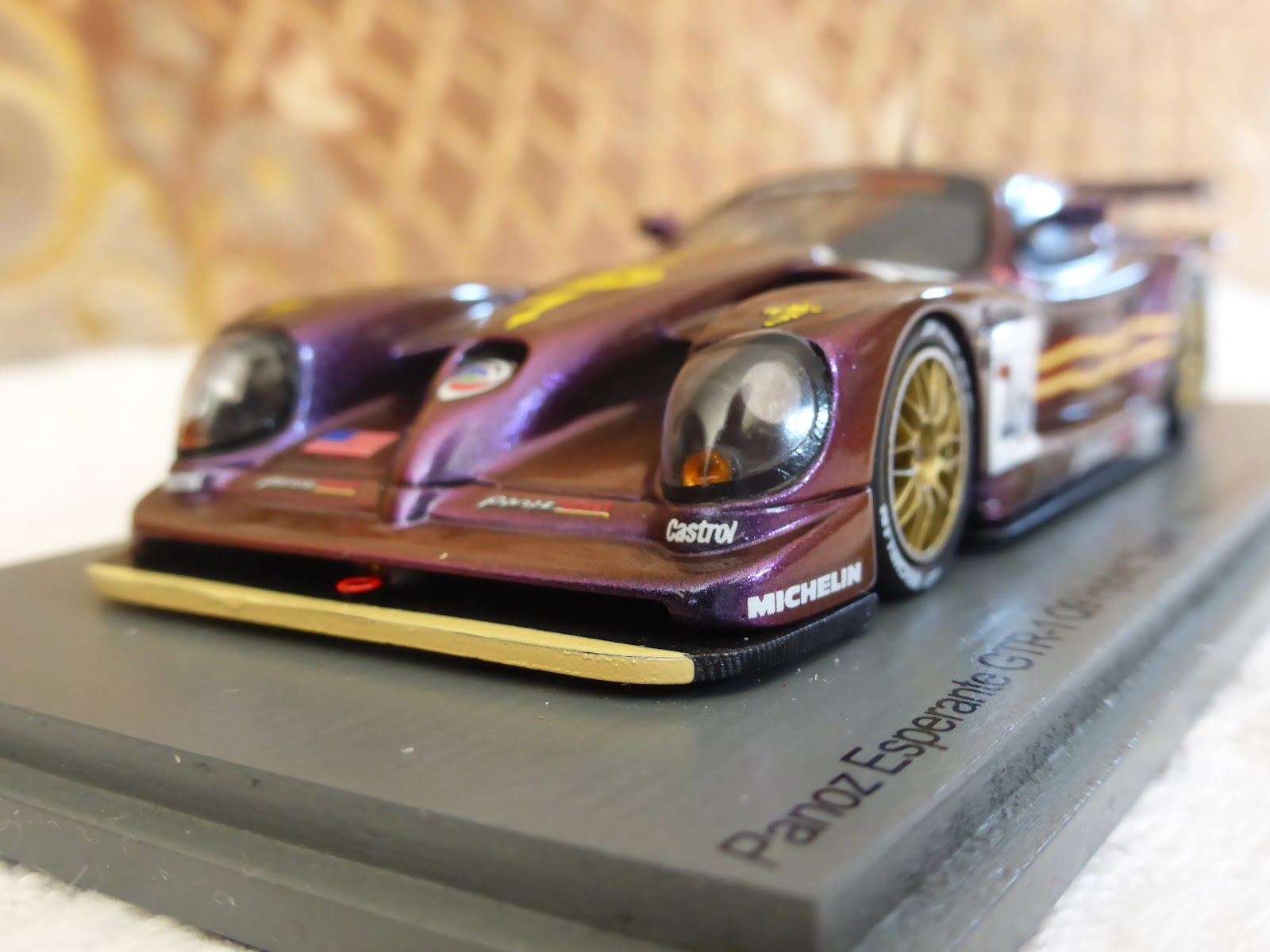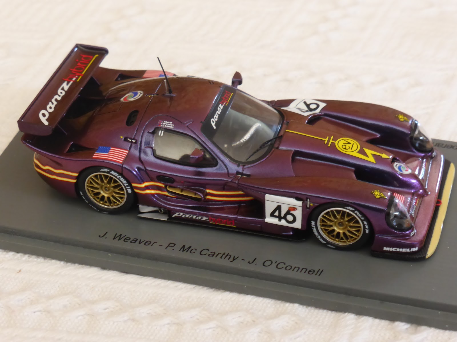 Sfortunatamente i piloti non riuscirono a staccare un tempo valido per l\’ammissione alla gara, in una sessione che fece altre vittime illustri, come due delle tre Porsche K8 di Kremer, le due Porsche 911 GT1 di Zakspeed e quella di Larbre Competition e la WM con motore alimentato a GPL. A suo tempo, questa particolare Panoz, decorata in un attraente color porpora cangiante con strisce gialle scontornate di rosso, non sfuggì a Starter che ne ricavò uno dei suoi tradizionali kit in resina, e come al solito toccava ai modellisti il non sempre facile compito di ricavarne qualcosa di decente, a iniziare dal colore della carrozzeria, tutt\’altro che scontato.