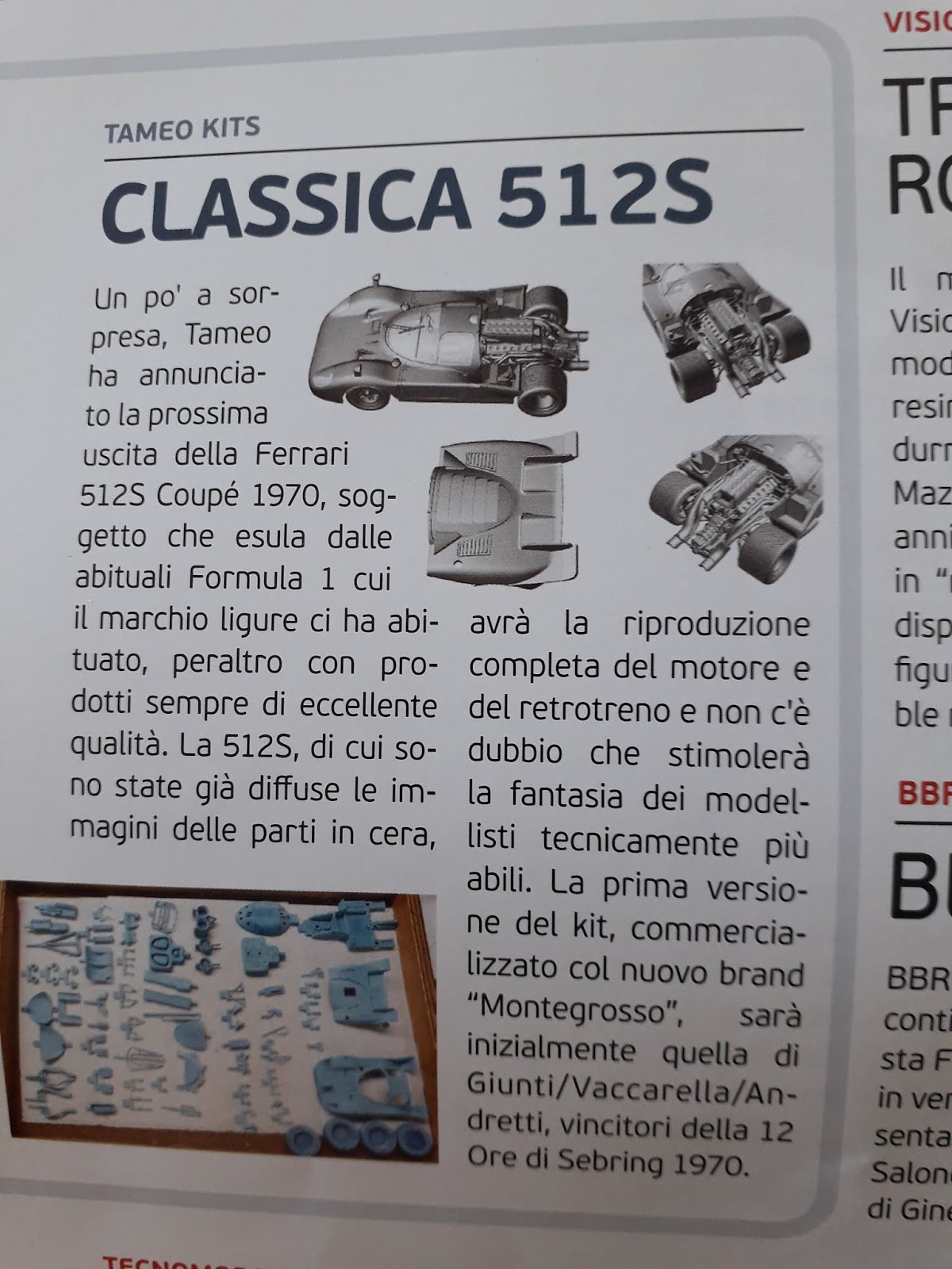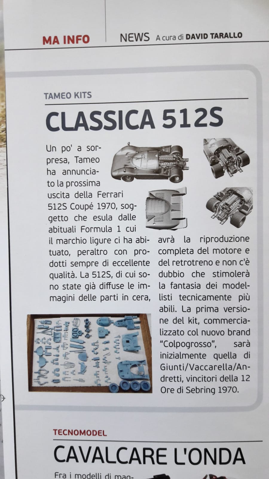 Quando dici che uno casca dalle nuvole… stamani mentre ero in coda al supermercato mi arriva una mail da Tameo: \”Abbiamo letto il suo bell\’articolo su ModelliAuto e vorremmo precisare che la ditta della nuova Ferrari 512S si chiama Montegrosso e non Colpogrosso. Sappia che in questo brutto periodo ci ha fatto sorridere ed è stata una buona cosa :-))\”. EH!!!??? Concedendo sempre il beneficio del dubbio a ciò che faccio (parto sempre dal presupposto di aver sbagliato io, la buona prassi giornalistica impone che fidarsi di se stessi è bene e non fidarsi è meglio). Parecchio spiazzato vado a rivedermi l\’impaginato della Infonews del numero 139, dove si trova il \”pallino\” – non è proprio un articolo – e quello che leggo è il nome corretto della nuova gamma di Tameo, \”Montegrosso\”. Sulla copia cartacea della rivista, idem con patate. Beh qualche buontempone avrà voluto fare il pesce d\’aprile al nostro Tameo, magari inviandogli per Whatsapp un\’immagine ritoccata. Gli garantiamo il classico quarto d\’ora di celebrità (anonima) pubblicando lo scambio di nomi, che ai meno giovani ricorderà quel disinvolto programma di Umberto Smaila che ha fatto storia. Più che a Tameo questo scambio boccaccesco l\’avrei visto meglio fatto nella cerchia di Brumm, che di burle di questo tipo se ne intende. Però, riflettendo… \”Colpogrosso\” non era poi così male per una marca di modelli. No?