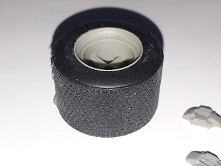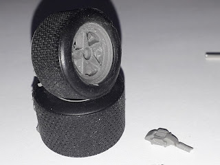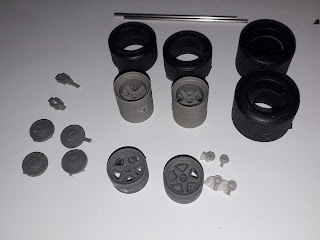 Tutto, comunque, è molto semplice e non richiede competenze particolari. Stampati in resina anche dischi e pinze freno, i mozzi (quando previsti) e i dadi di fissaggio. In alcuni set sono presenti estensioni in alluminio tornito, molto ben fatte, da accoppiare al cerchio in resina. Le gomme sono ben progettate, ma anch\’esse richiedono una preparazione per eliminare bavette e segni di stampaggio. Fra i set più utili vi è quello per la Porsche 917 (1970-1971), catalogo numero ACW124010. In questo caso la confezione comprende quattro cerchi con dadi di fissaggio separati, i dischi freno con relative pinze e quattro pneumatici.