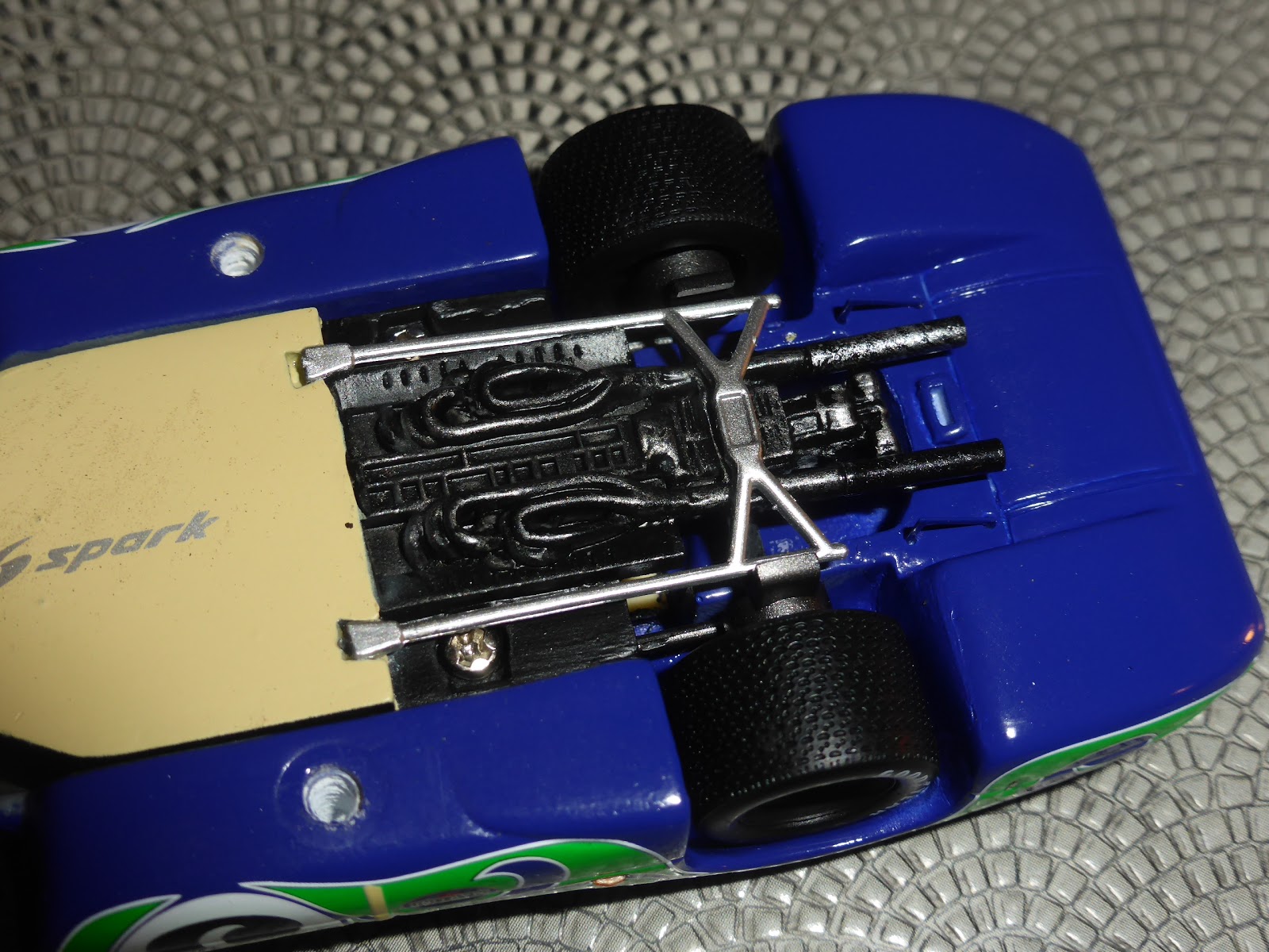 | La parte inferiore con alcuni tralicci del telaio e la parte inferiore del motore, i cui dettagli sono evidenziati con la tecnica del dry brushing. |