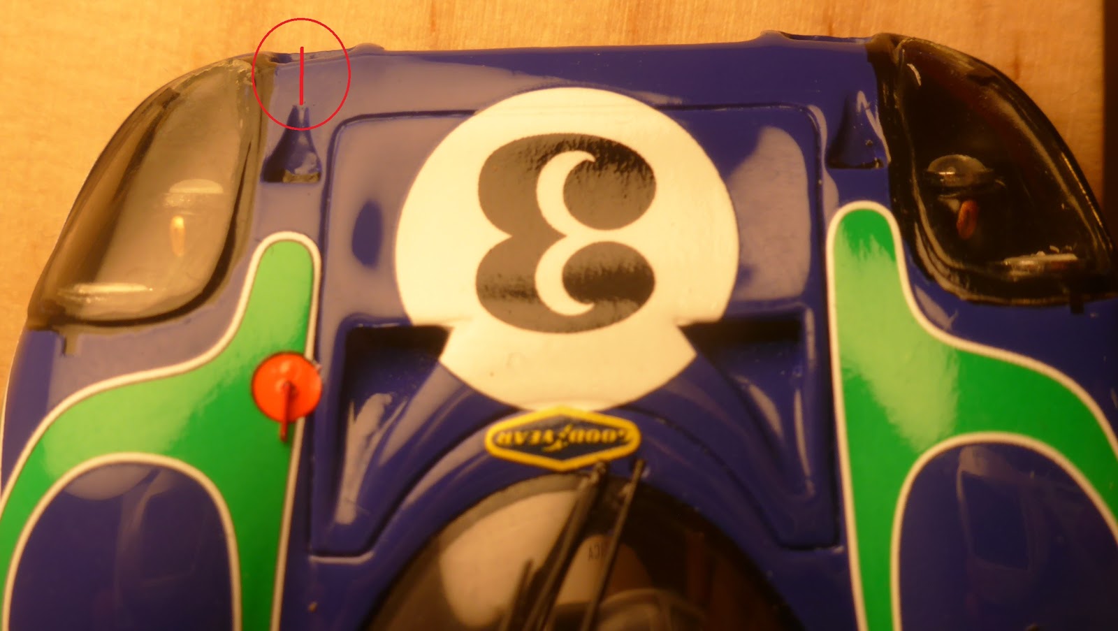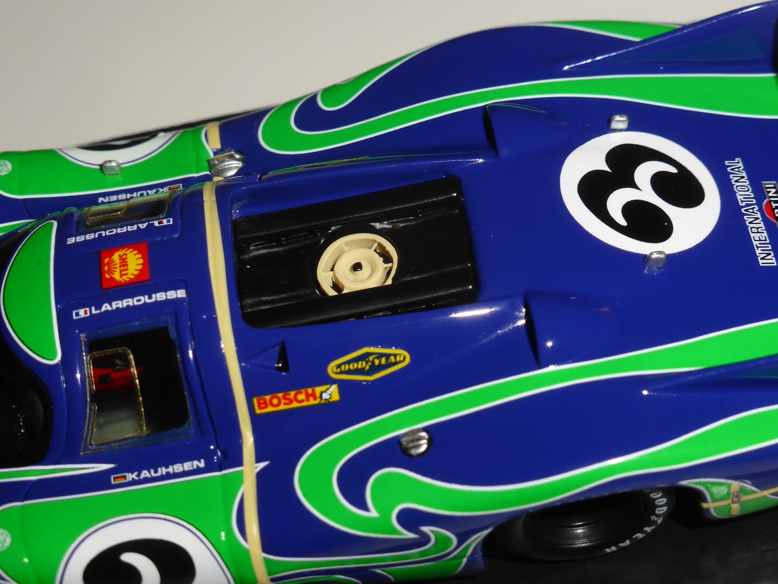 La decorazione è in decals e sembra applicata da un robot. La versione prescelta è quella completa di nastro adesivo color avorio che bloccava il cofano posteriore e qualche altra chiusura (ad esempio in corrispondenza col gancio fermacofano posteriore sinistro, che evidentemente non bloccava a dovere).