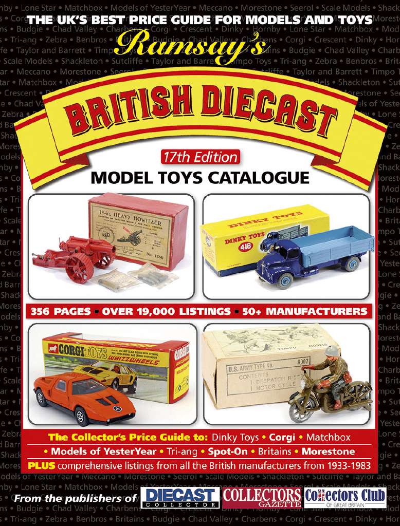 Dopo due anni, arriva un aggiornamento del Ramsay\’s British Diecast Model Toys Catalogue, una delle guide più complete e attendibili del settore. Sarà questa la diciassettesima edizione, che comprende una lista con le quotazioni raggiunte di recente non solo da Dinky Toys e Corgi Toys, ma anche Lesney Matchbox, Tri-Ang Spot-On, Budgie Toys, Morestone, Lone Star, Britains, Crescent e altre marche. Quest\’ultima edizione è stata completamente aggiornata con nuove varianti, nuove foto e quotazioni riviste. Le quasi 400 pagine copriranno non meno di 3000 referenze. Pubblicheremo una recensione approfondita non appena la guida sarà disponibile.