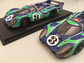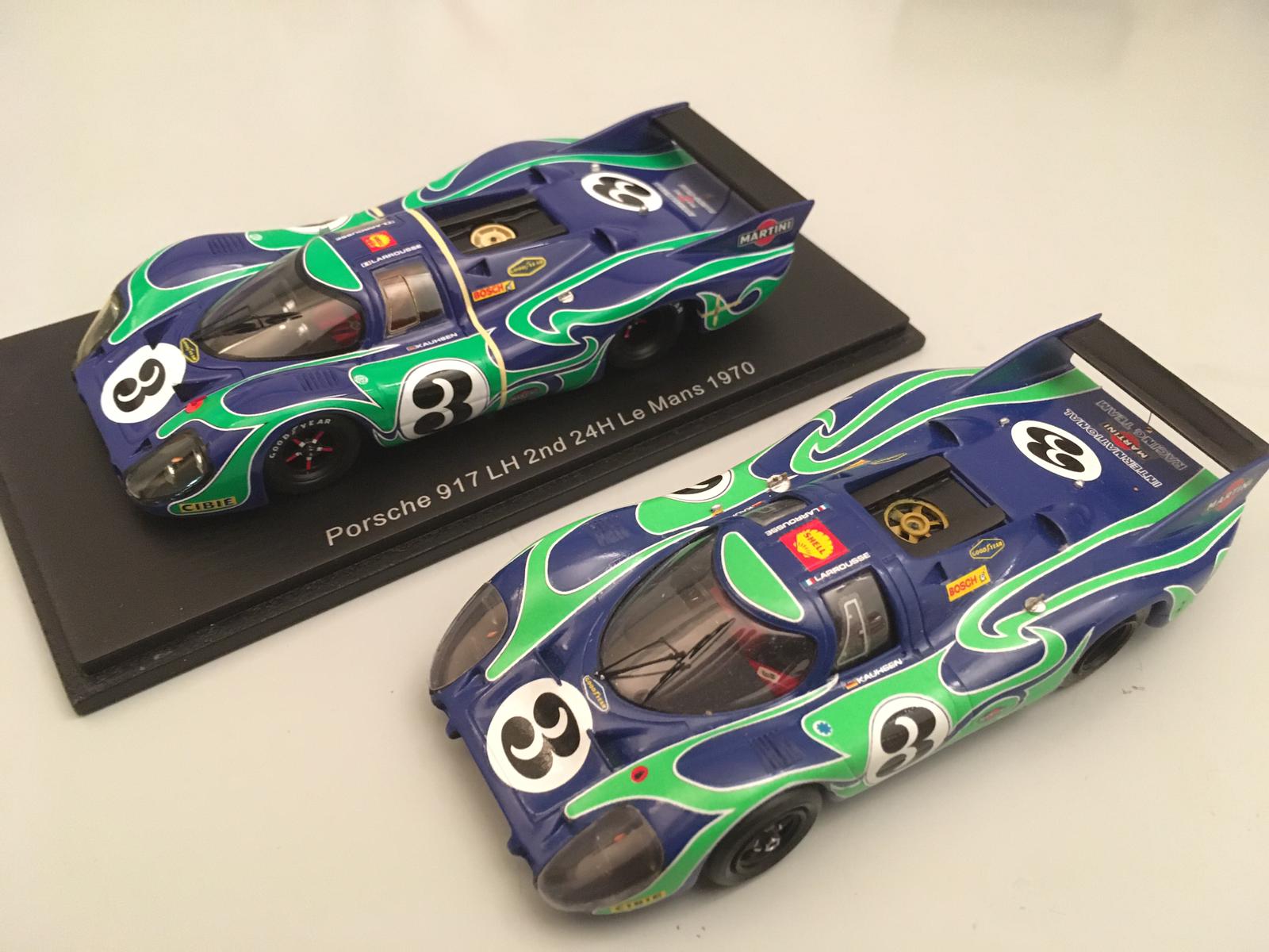 Lo scorso 26 giugno avevamo pubblicato la recensione della Porsche 917LH di Spark e le conclusioni erano state condizionate dal giudizio sulla linea del muso che aveva qualche cosa di strano (l\’articolo è visibile a questo link: https://grandiepiccoleauto.blogspot.com/2020/06/porsche-917lh-martini-le-mans-1970.html ). Ora, grazie alla collaborazione di Massimo Martini, è possibile pubblicare una serie d\’immagini di confronto fra l\’odierno Spark e un modello che è sempre stato il punto di riferimento per la 917LH, vale a dire il Provence Moulage, venduto in kit negli anni ottanta. Il confronto delle foto mostra probabilmente la soluzione della questione: lo Spark sembra tozzo non per una insufficienza nella lunghezza del muso, ma per l\’andamento eccessivamente \”pesante\” della linea dei passaruota e in generale di un po\’ tutta la sezione frontale.