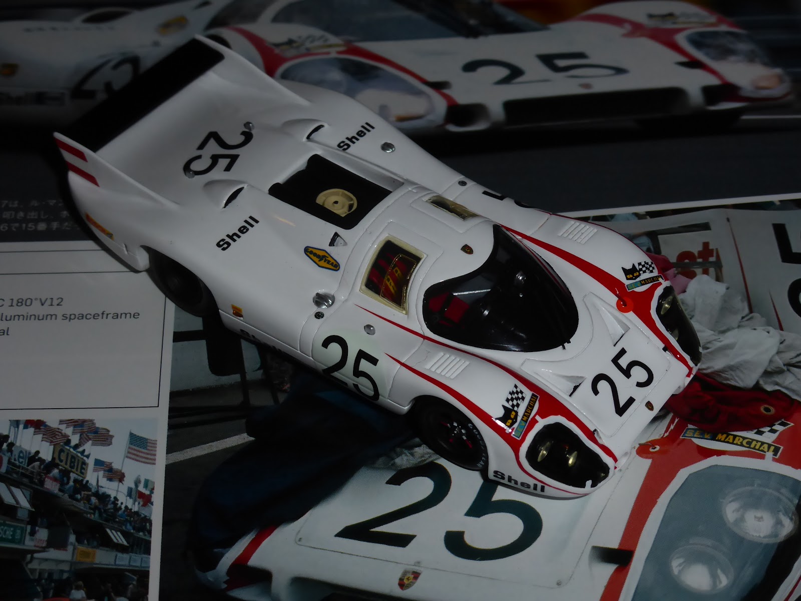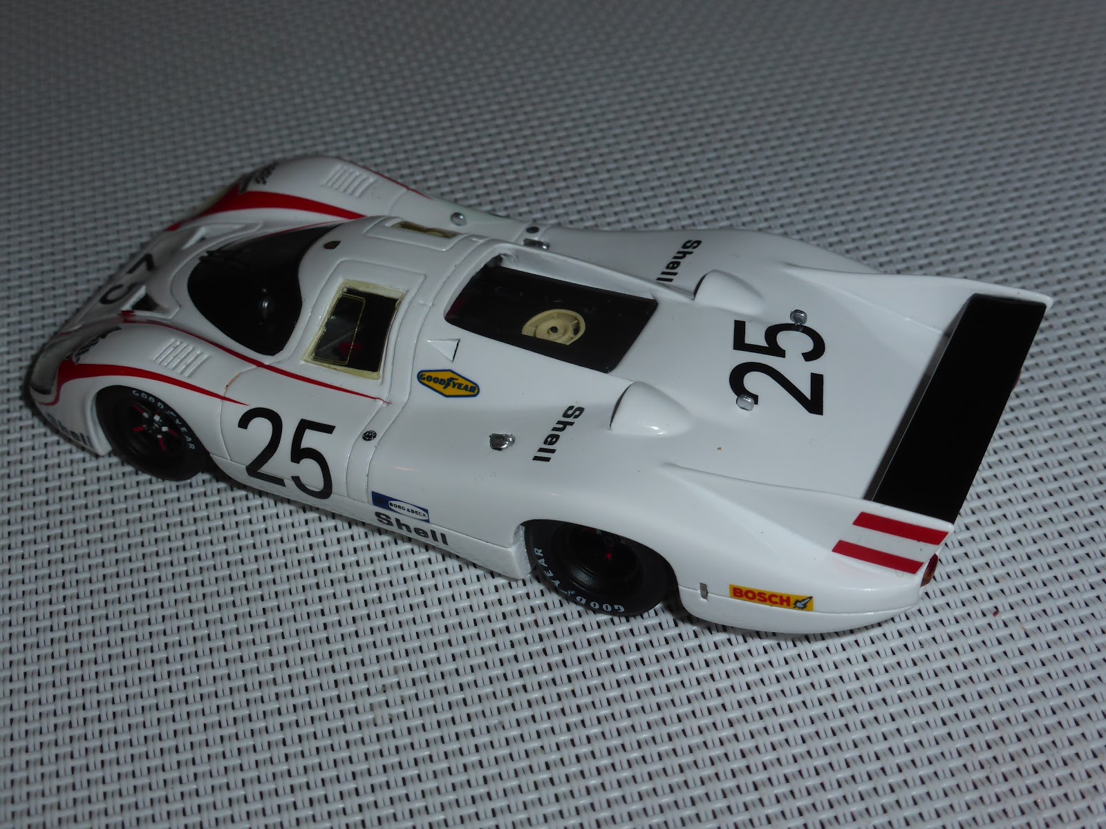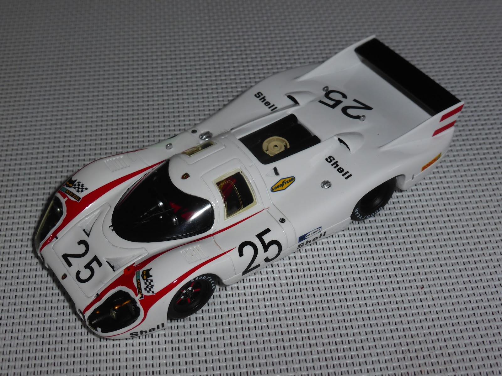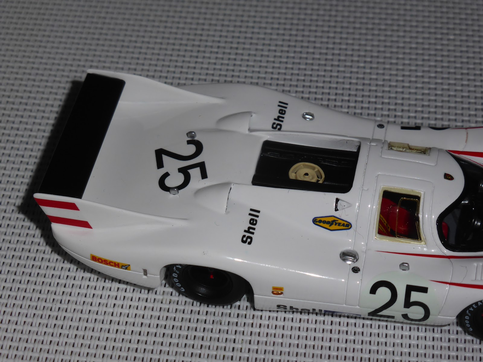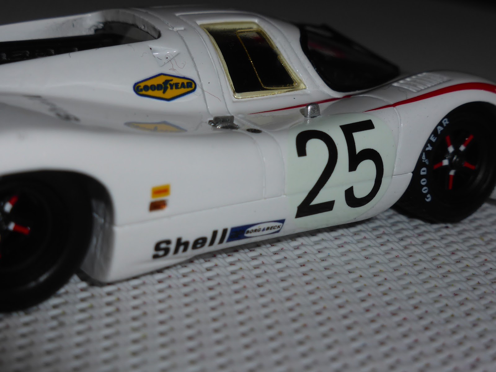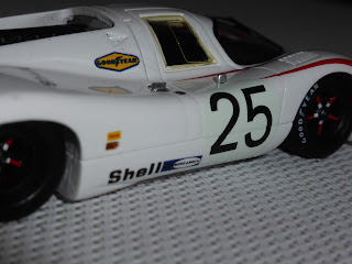 Non sono state poi tagliate le decals rosse all\’altezza delle due piccole prese d\’aria NACA sull\’anteriore e mancano le freccine nere applicate sul passaruota all\’altezza di ciascun pneumatico. Ci siamo invece per quanto riguarda luci e lucine varie, compresa quella rettangolare sul lato destro. Per molti altri dettagli vale il discorso fatto un po\’ di tempo fa sulla vettura numero 3, per cui rimando il lettore a quel thread: https://grandiepiccoleauto.blogspot.com/2020/06/porsche-917lh-martini-le-mans-1970.html .