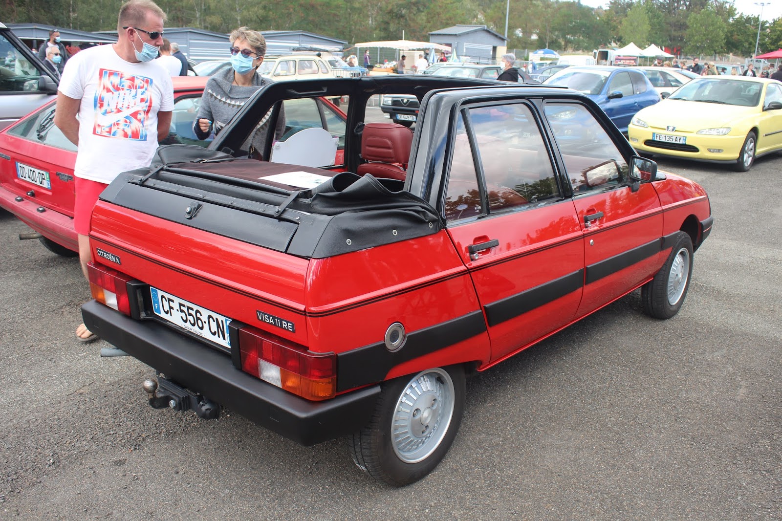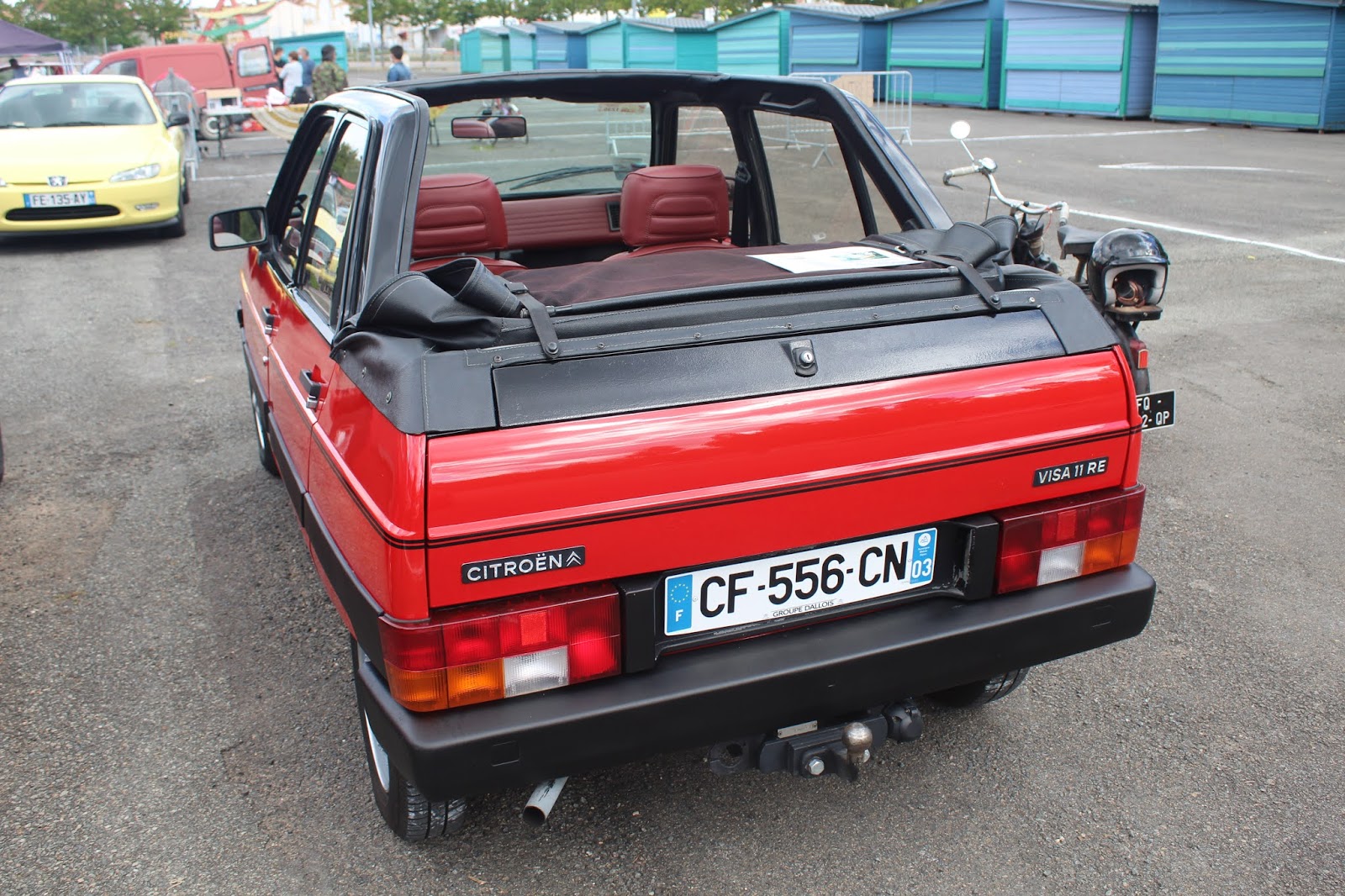 La Citroёn Visa non è certo passata alla storia per il suo stile. Anzi, è considerata come una delle vetture che hanno dato il via alla progressiva e inarrestabile banalizzazione della marca, dopo la partenza di disegnatori di enorme talento come Flaminio Bertoni e Robert Opron e il passaggio da Michelin a PSA. Lungi dall\’essere una cattiva macchina, la Visa, che era una specie di ibrido basato sulla Peugeot 104 (ad eccezione della versione bicilindrica) aveva il solo difetto di non avere una personalità ben definita, cosa che gli appassionati della marca non erano disposti a perdonarle, esattamente come accadeva nello stesso periodo con la LN. La storia della Visa, tuttavia, non si esaurisce con le normali versioni, ma – come tutti sanno – ebbe dei risvolti forse inattesi con le varianti sportive come la 1000 Pistes. Piuttosto rara fu una configurazione cabriolet prodotta da Heuliez in 2633 esemplari dal 1983 al 1995. Chiamata \”Plein air\” in Germania e \”Convertible\” in Inghilterra, la Visa scoperta (11RE con motore da 1124cc) è oggi piuttosto rara. Presentiamo le immagini di un esemplare in perfetto stato, esposto oggi in occasione di una mostra-mercato organizzata dall\’Auto Club des Combrailles a Saint-Eloy-les-mines (Francia). La vettura delle foto è del 1984 ed è iscritta all\’Ecurie Bourbonnaise des amateurs de véhicules anciens di Cusset.