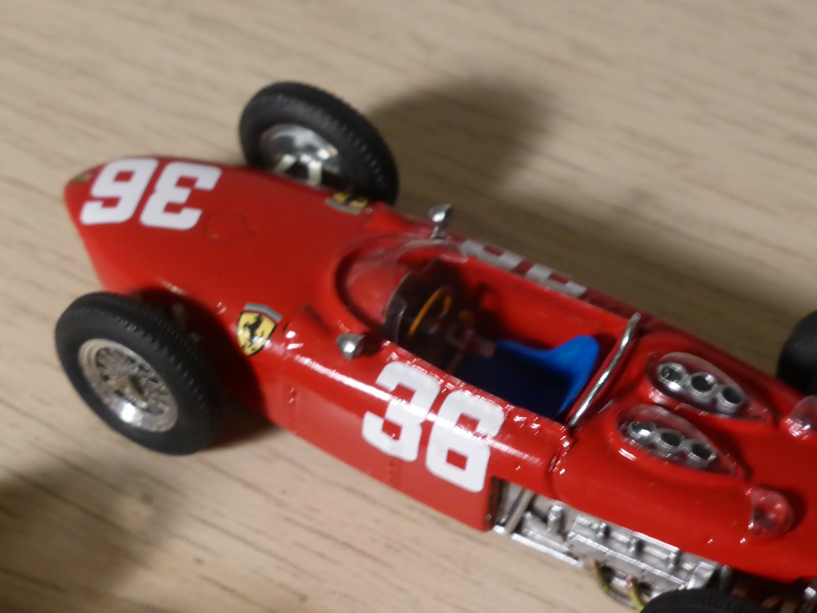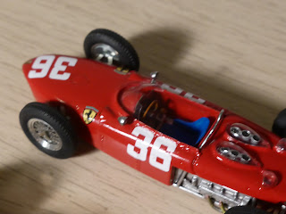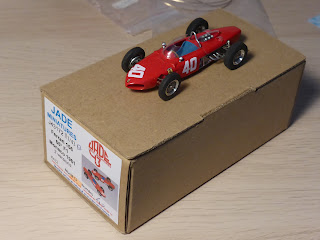 Come andò lo sanno tutti: il gioco di squadra della Ferrari non fu dei più brillanti ma quel giorno Stirling Moss con la Lotus sarebbe stato in ogni caso difficilmente battibile. Puntualmente Tanner avverte che Ginther, secondo classificato, aveva in uso il telaio 0001, mentre Hill (terzo) e Von Trips (quarto) utilizzarono rispettivamente i telai numero 0003 e 0002. A proposito di Ferrari F.1 a motore posteriore, vale la pena segnalare che Jade ha riprodotto anche il famoso prototipo 0008 motorizzato Dino 246, utilizzato nei test e nel GP di Monaco del 1960, con Ginther. La 156 di Jade è un modello ben fatto, molto semplice, composto essenzialmente da parti in resina, cui si aggiungono parti delle sospensioni in fotoincisione e vari piccoli dettagli. Buone le ruote a raggi fotoincisi.